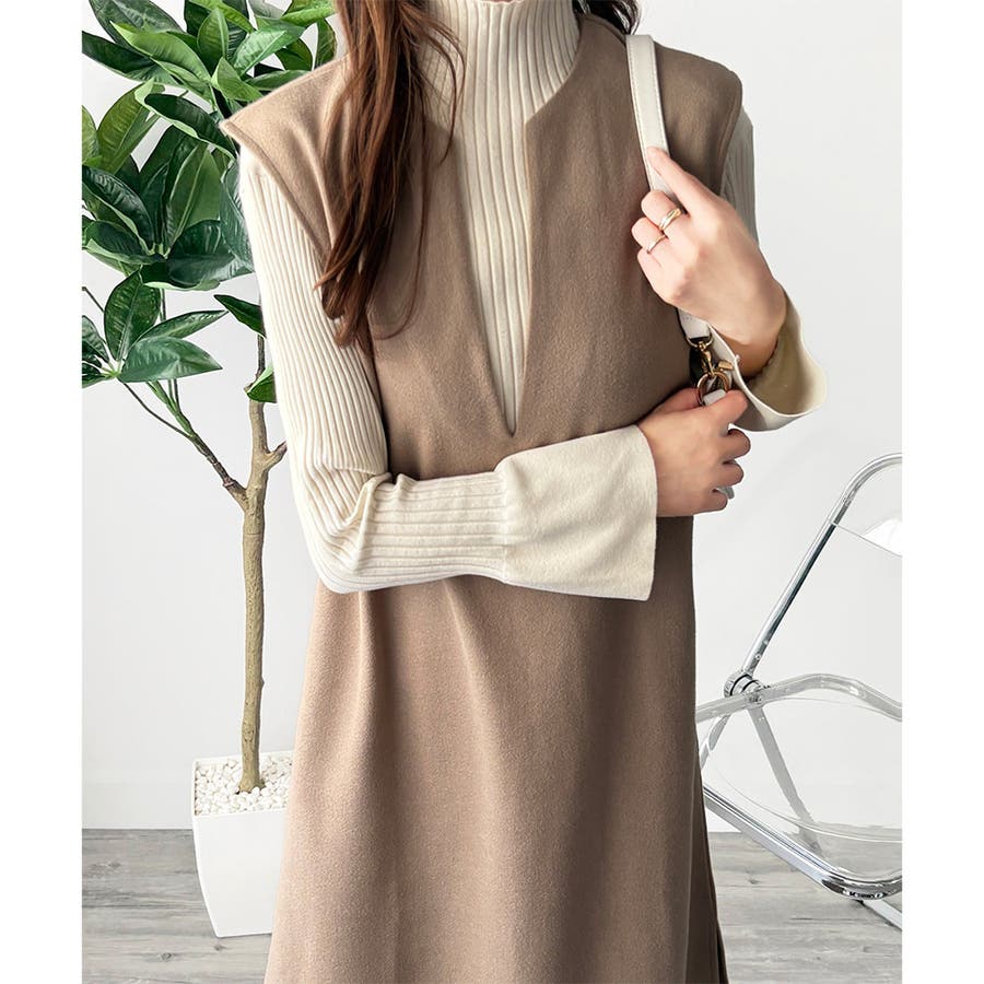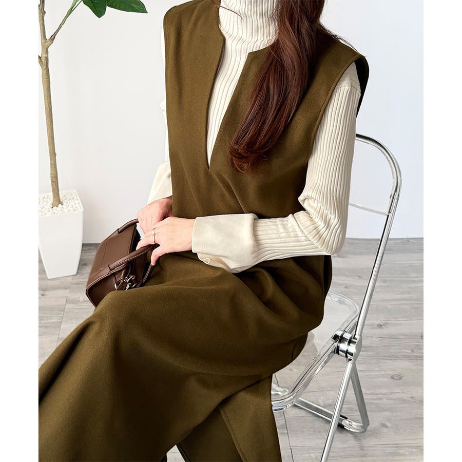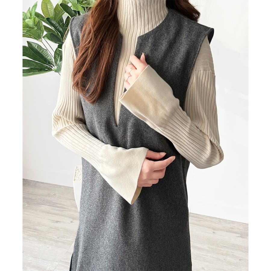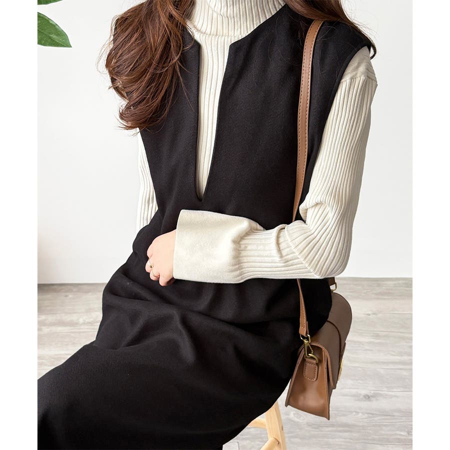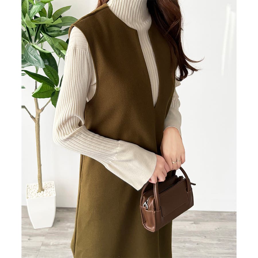 タートルネックやリブトップスを合わせると、上品なレイヤードが完成。