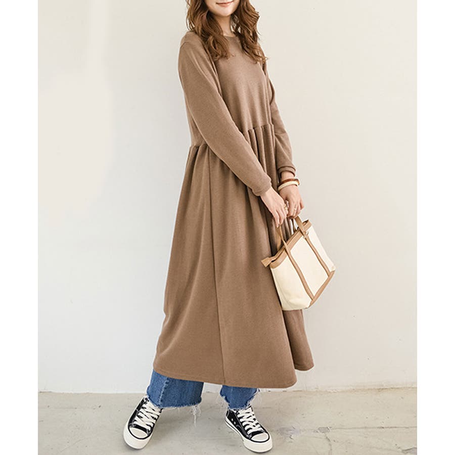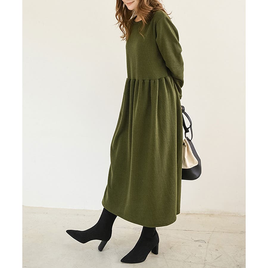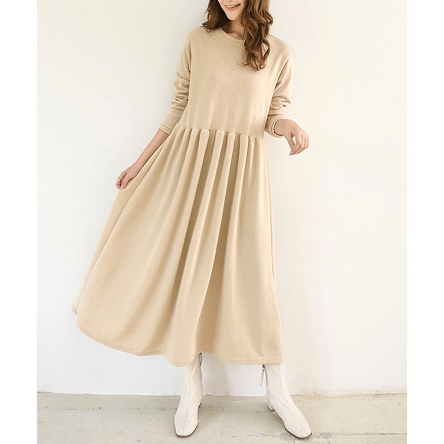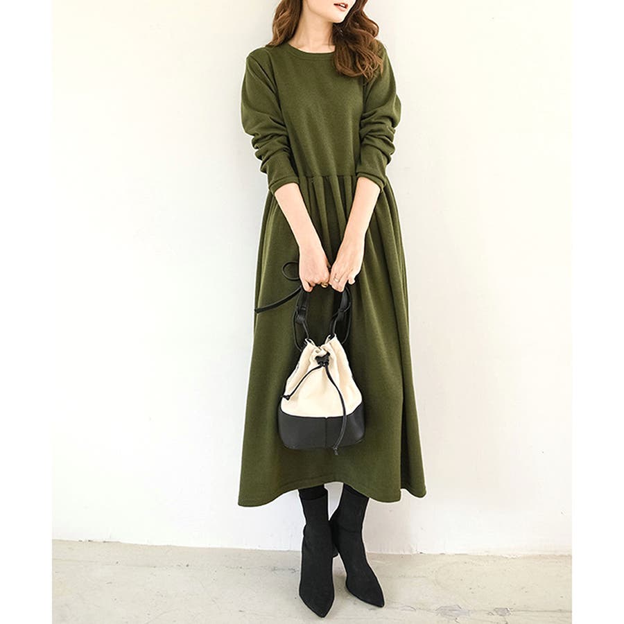 シンプルなクルーネックに、ウエスト切替が映えるロングワンピースです。
