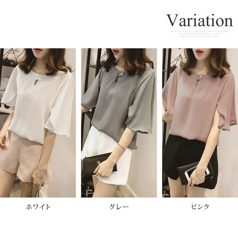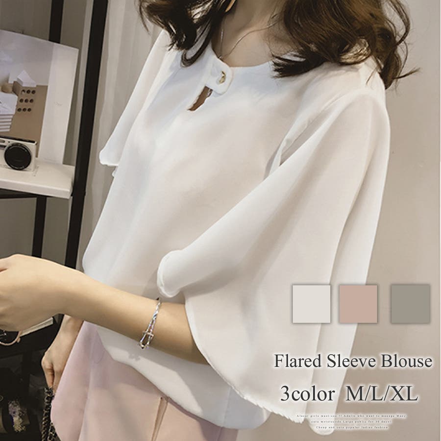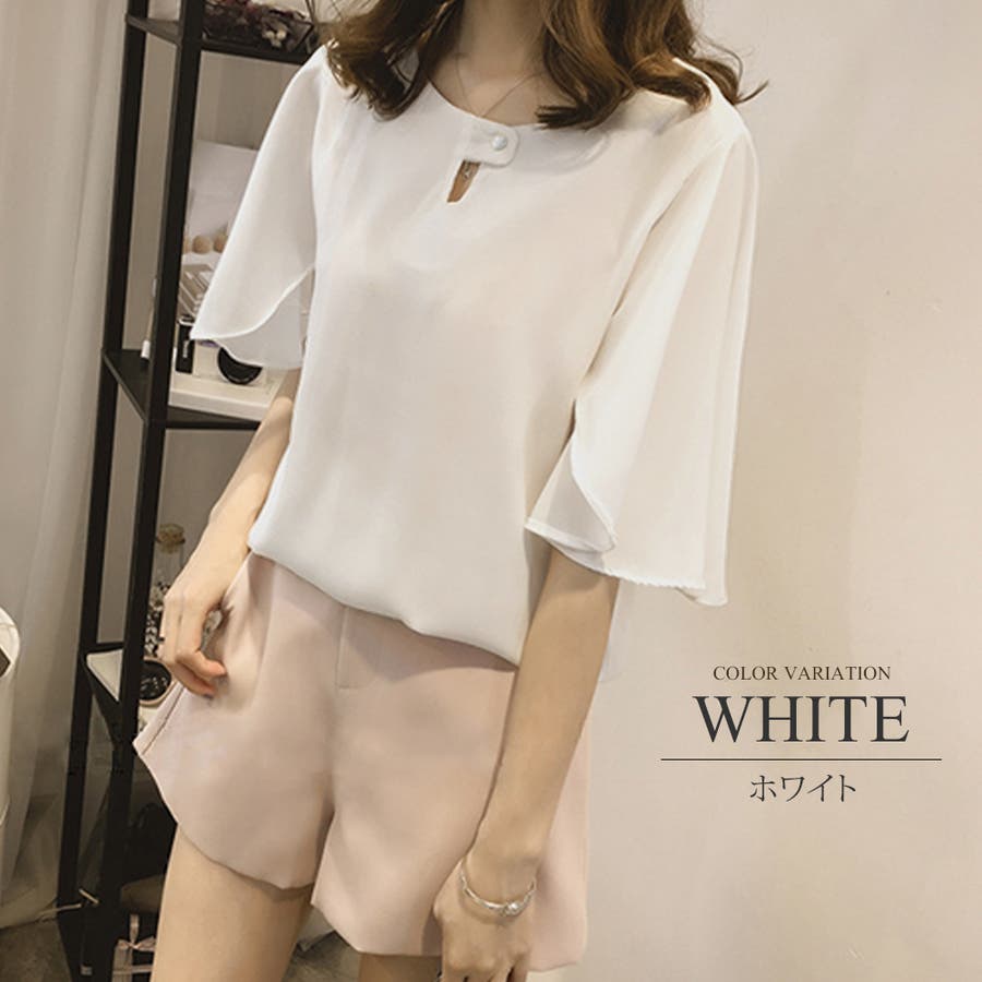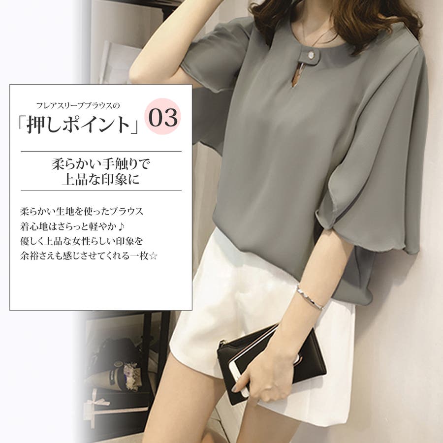 フレアスリーブブラウス 半袖 かわいい シンプル キレイ 通勤 夏 レディース