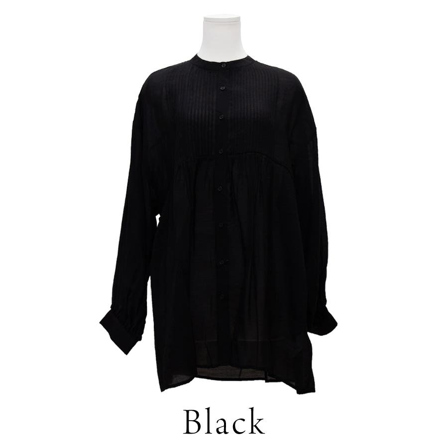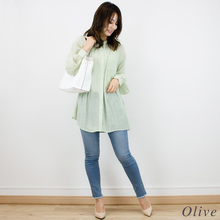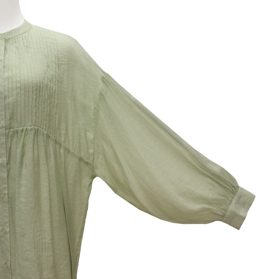 シアー素材にピンタックデザイン、バンドカラー。