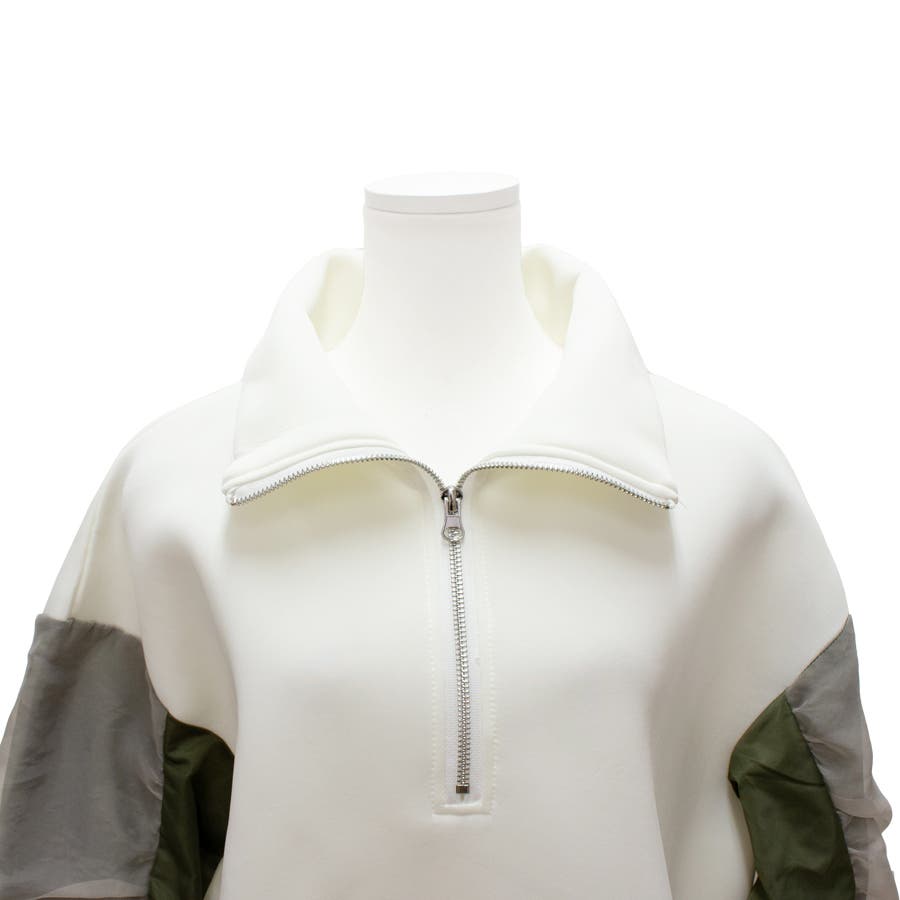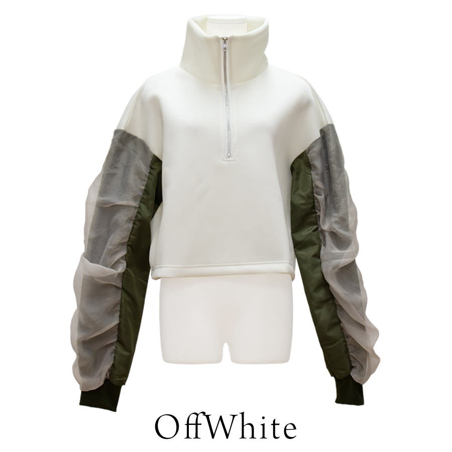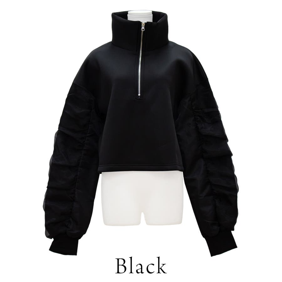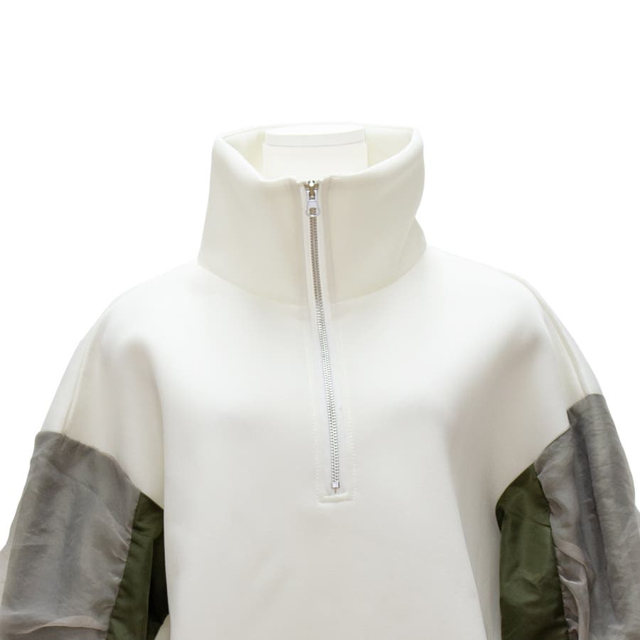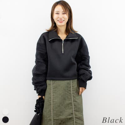 ダンボールニット×ハーフジップ、袖は切り替えと、デザイン盛沢山のトップス。