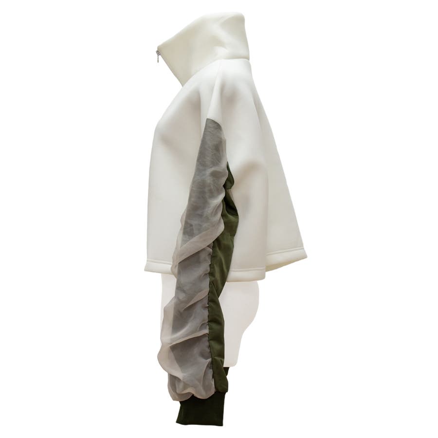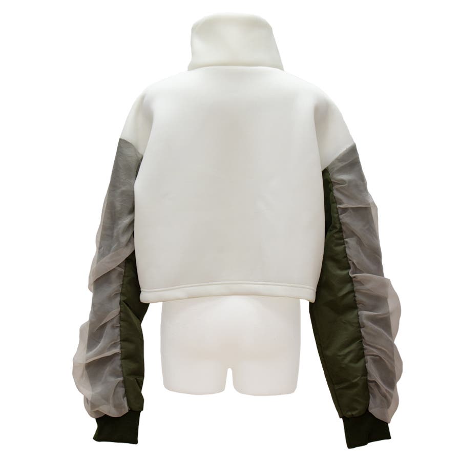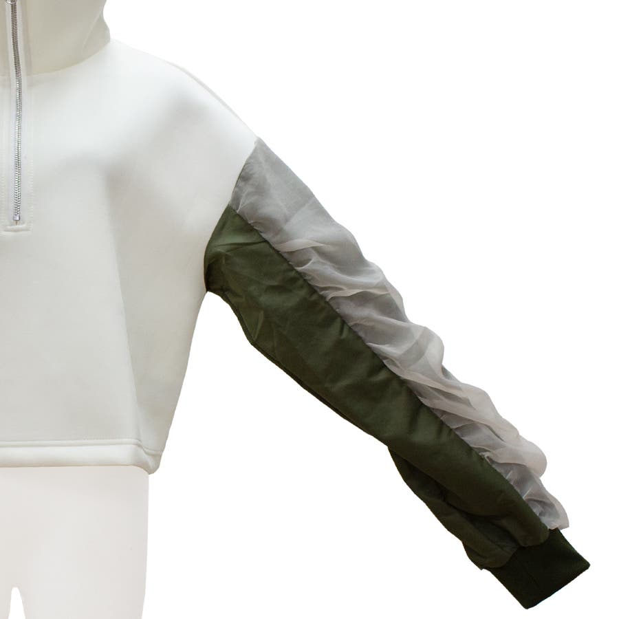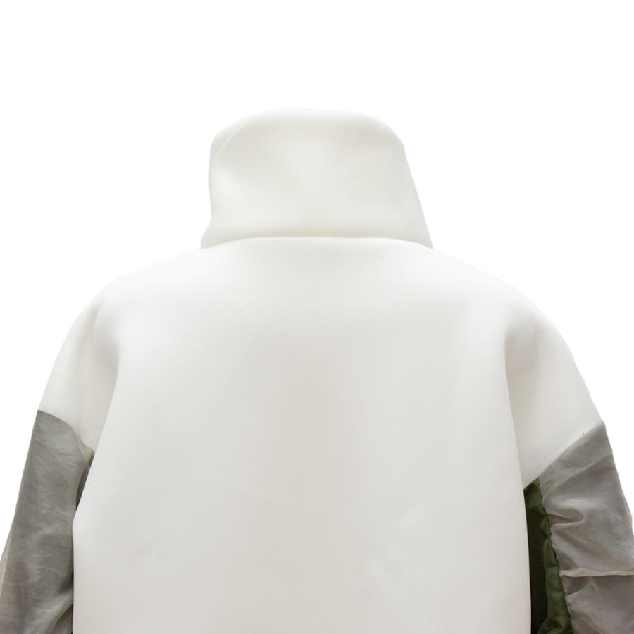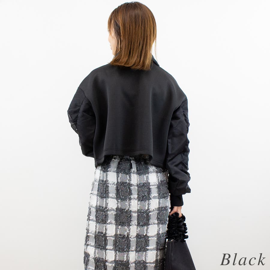 ダンボールニット×ハーフジップ、袖は切り替えと、デザイン盛沢山のトップス。