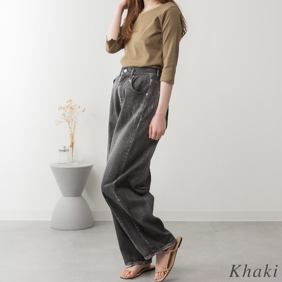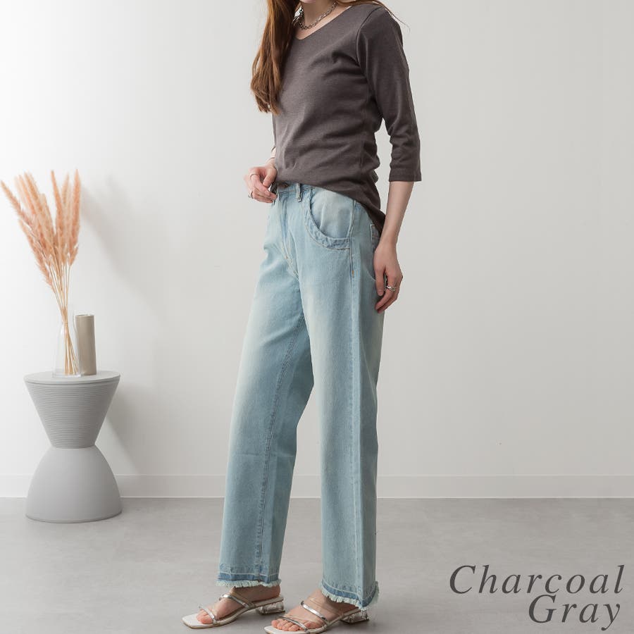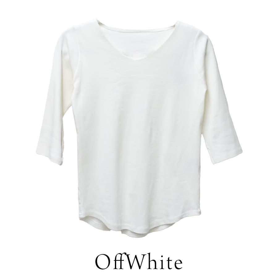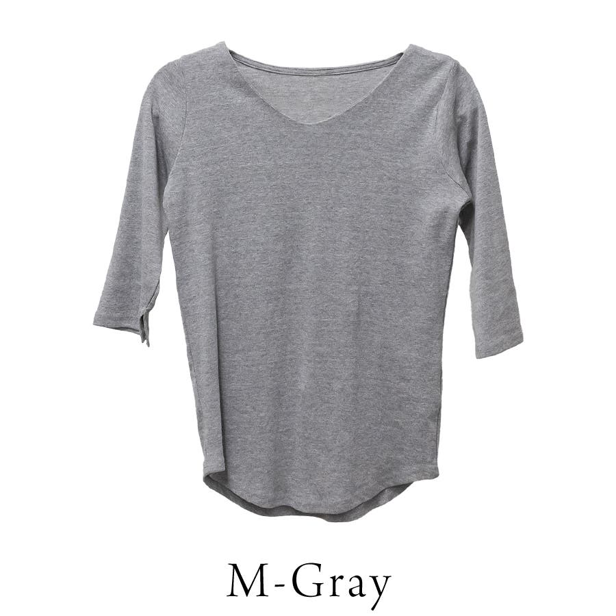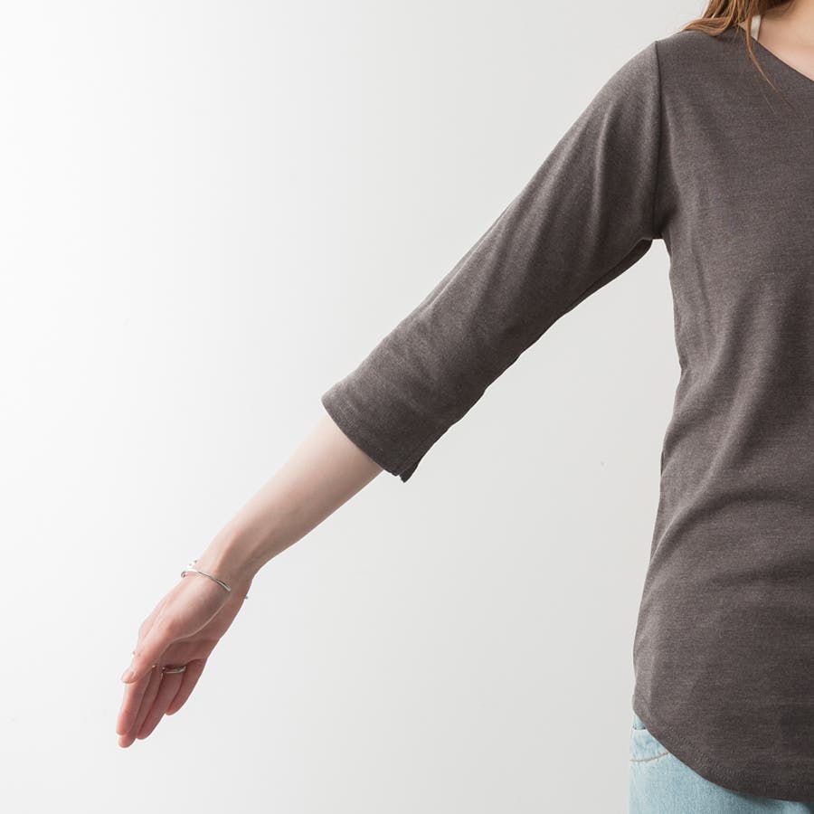 シンプルなデザインのVネック七分丈Tシャツ。