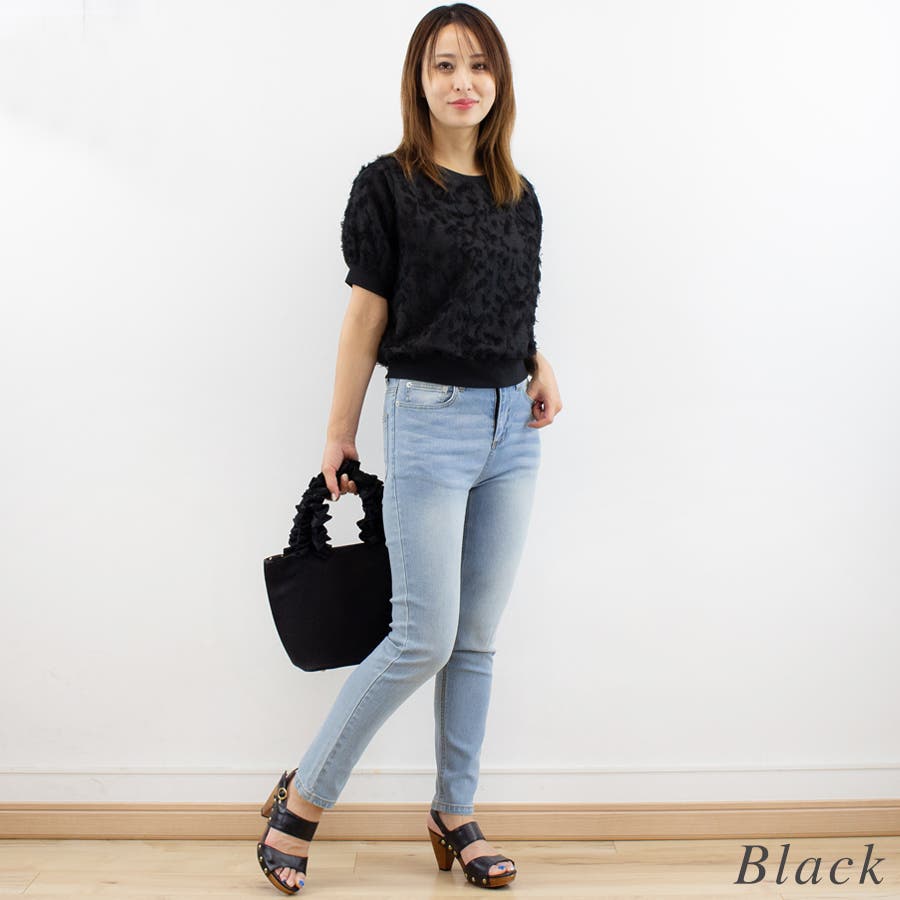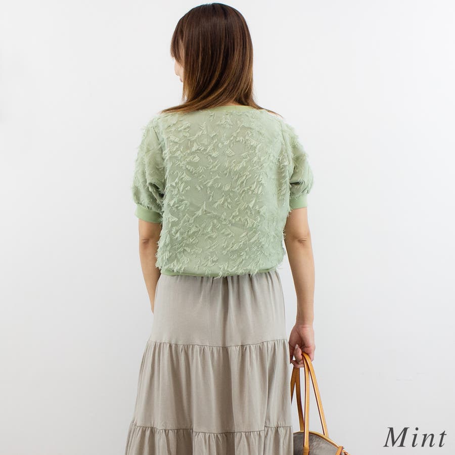 フリンジジャガードに短丈、バルーンスリーブがとってもかわいいトップス。