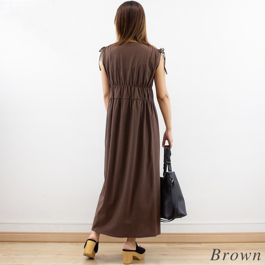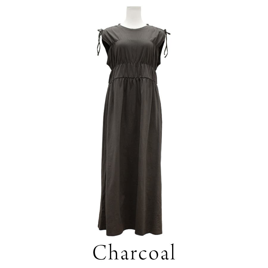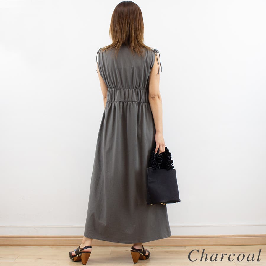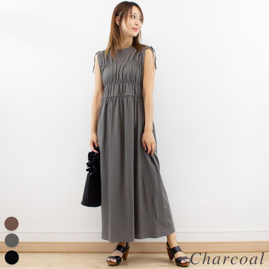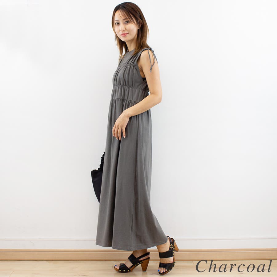 上半身のシャーリングと肩のリボンがポイントのワンピース