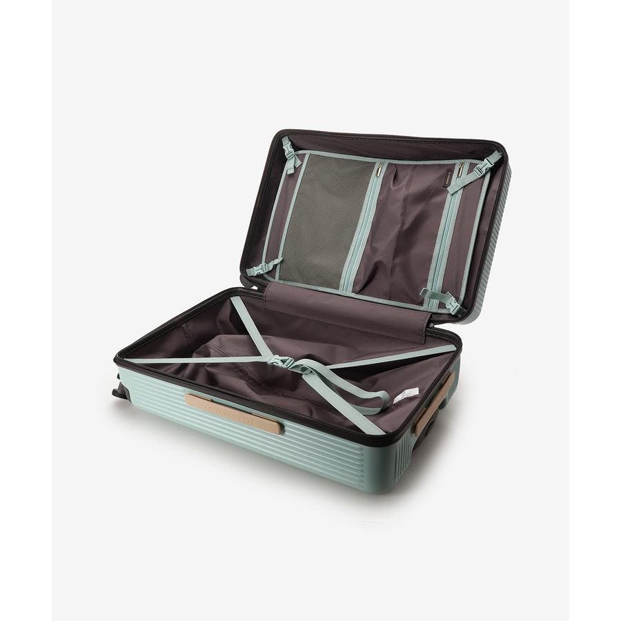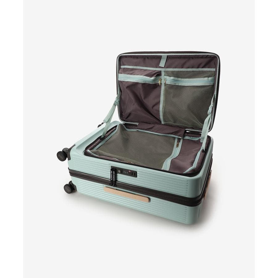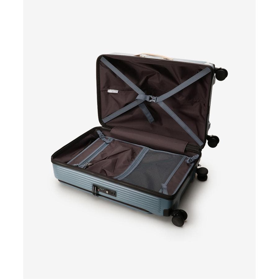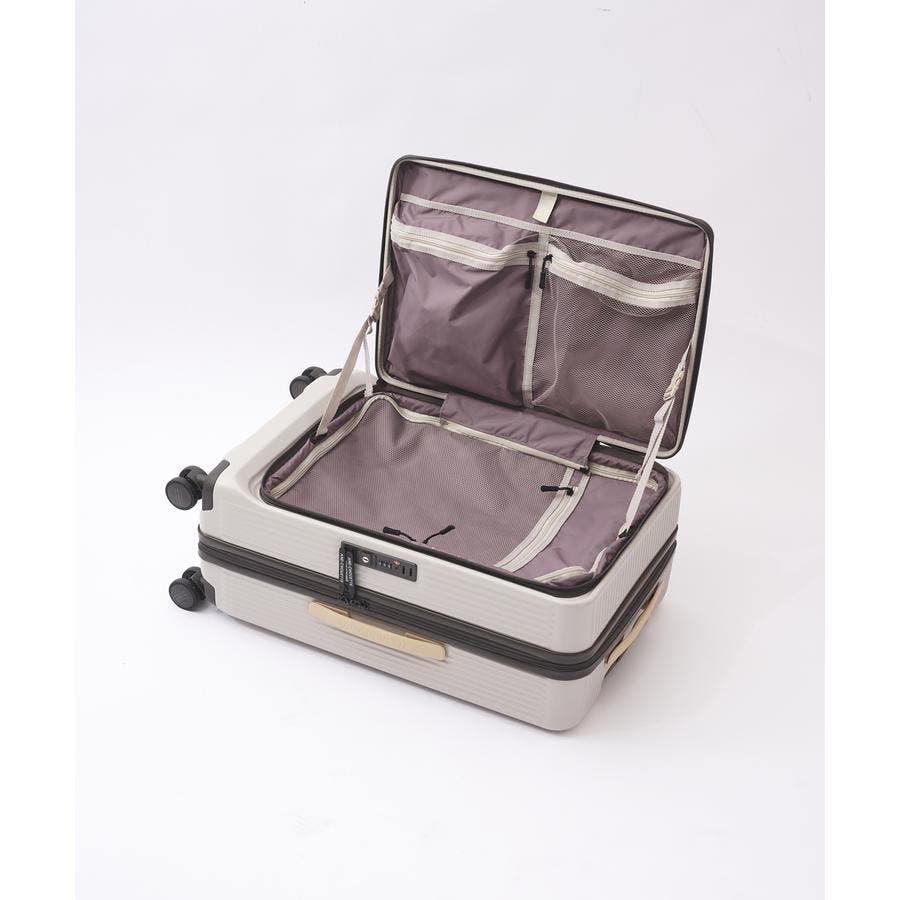 また、ボディは通常のキャリーのように横開きも可能。内装にはファスナーポケットや荷崩れ防止のベルトを備えています。