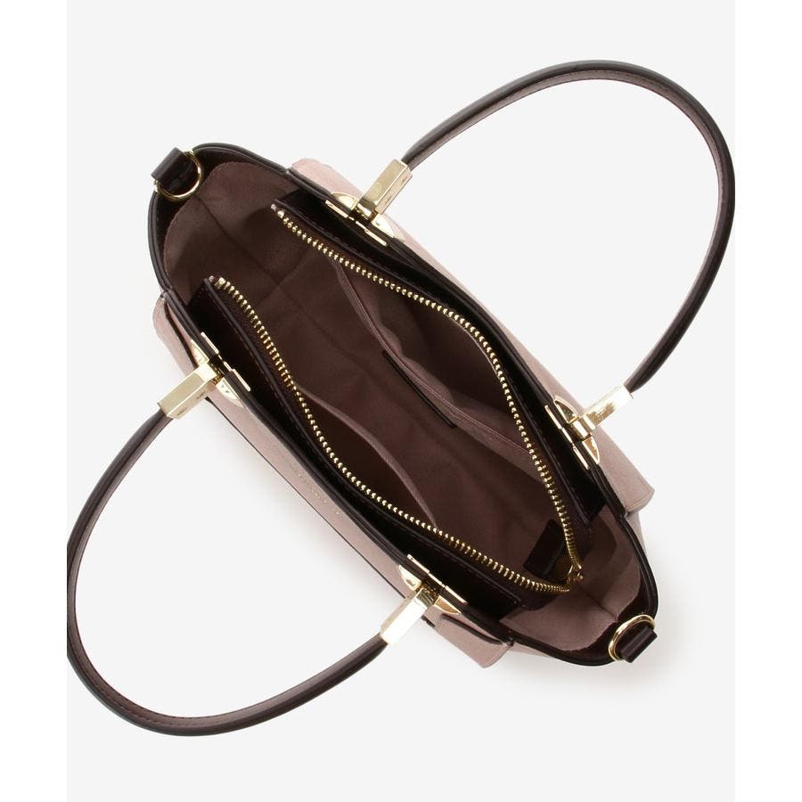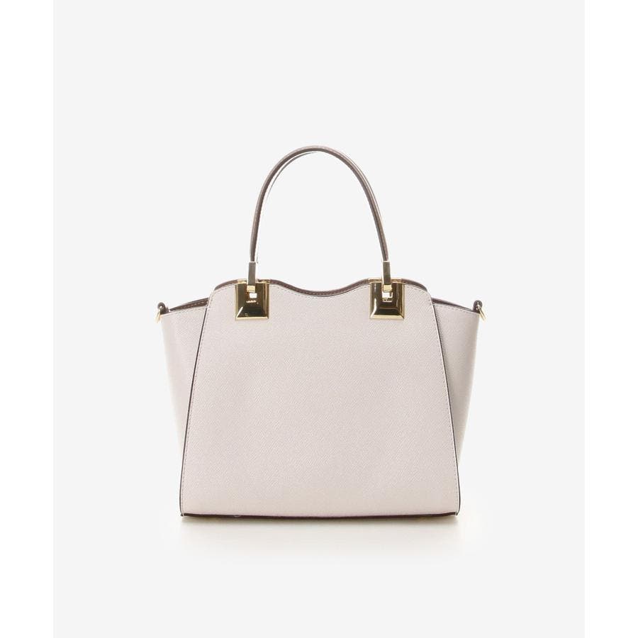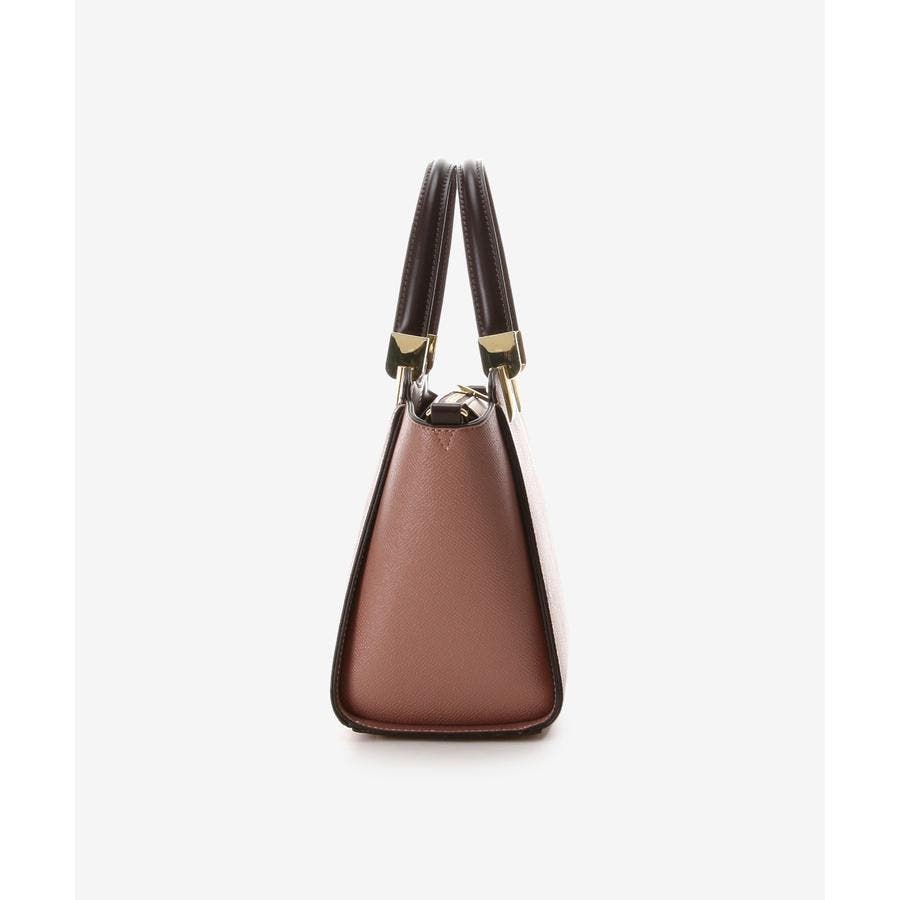 ボディには型押し合皮を使用し、ハンドルと本体内側、ショルダーはスムース合皮を用い、配色で仕上げ高級感を演出しております。