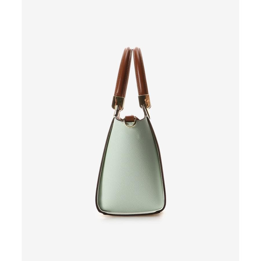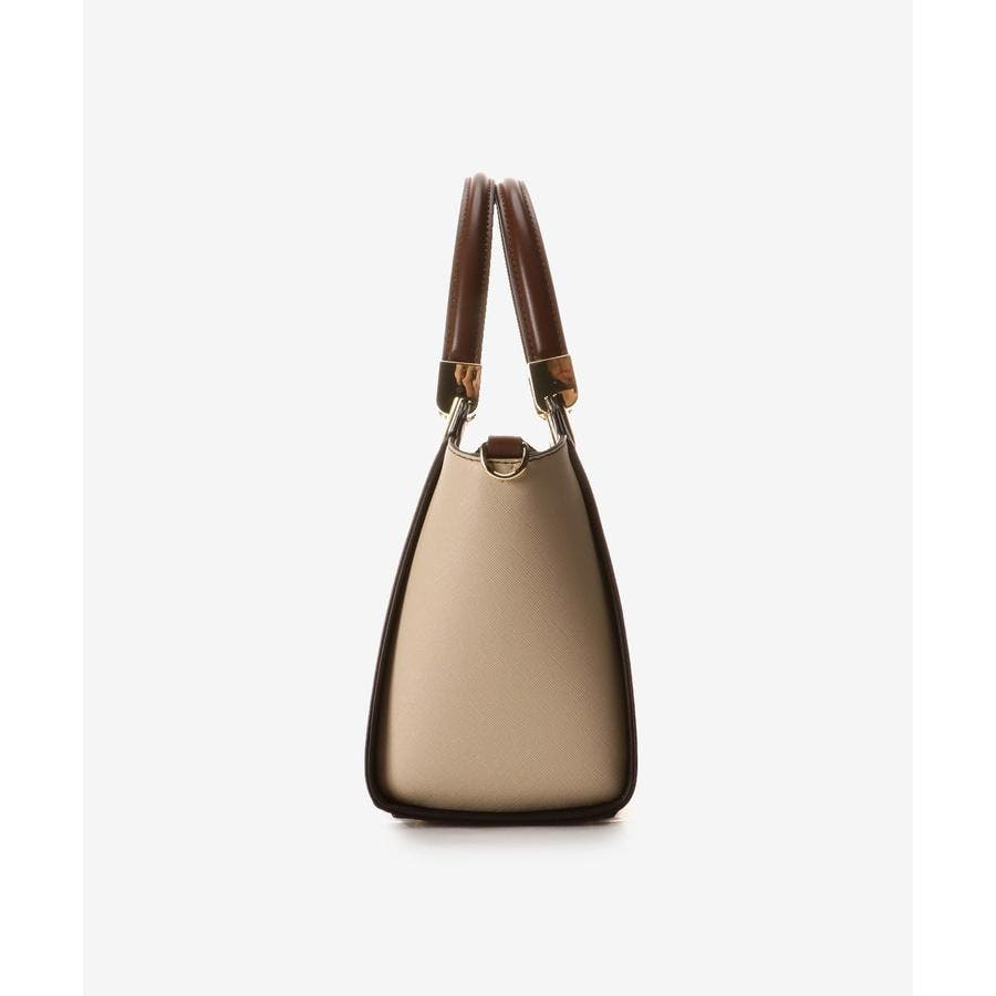 ボディには型押し合皮を使用し、ハンドルと本体内側、ショルダーはスムース合皮を用い、配色で仕上げ高級感を演出しております。