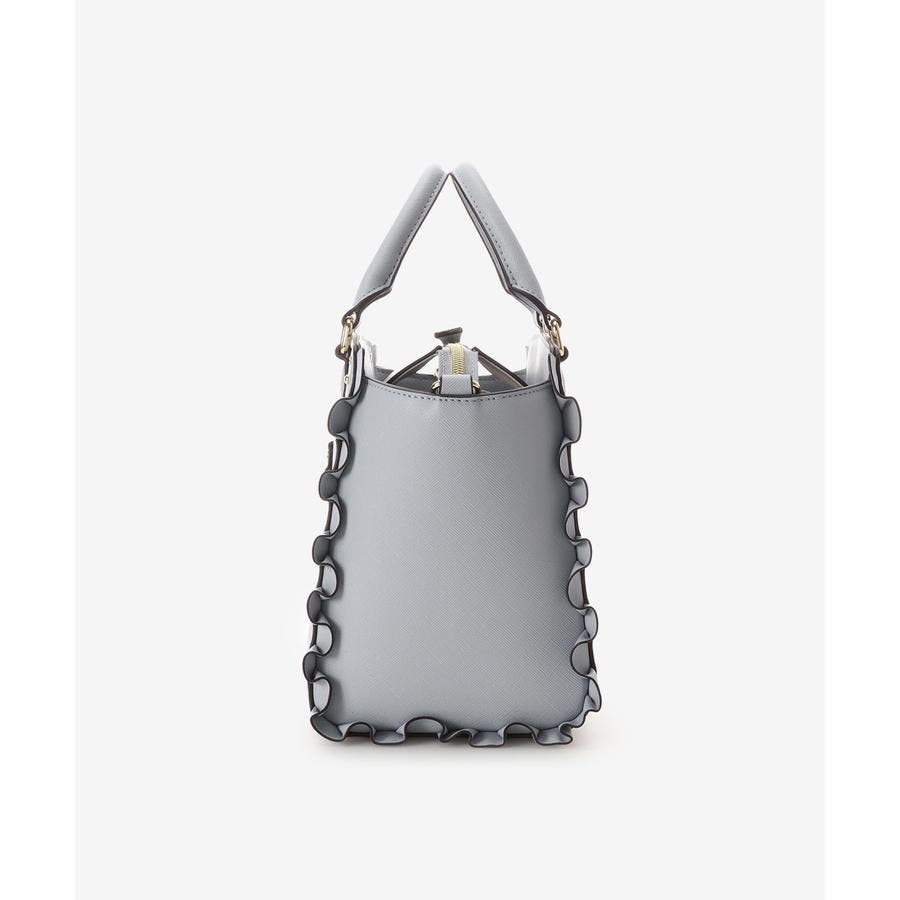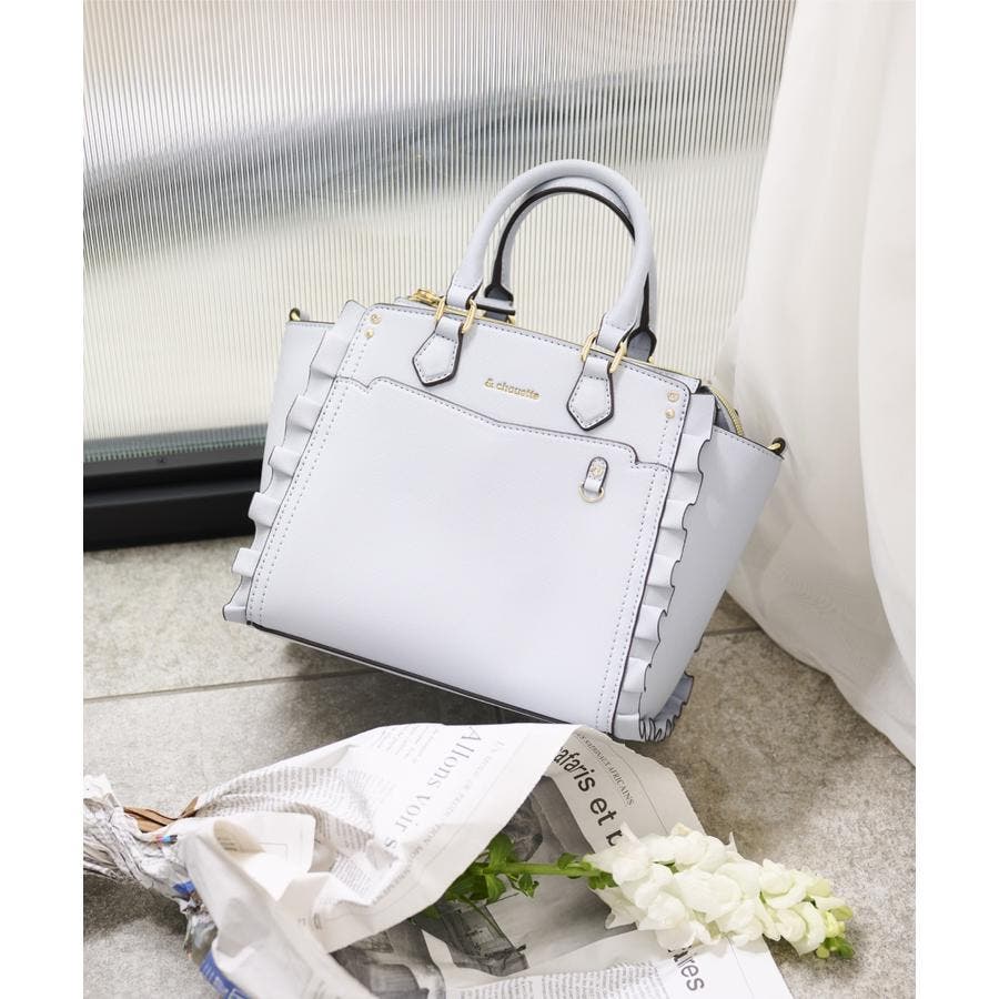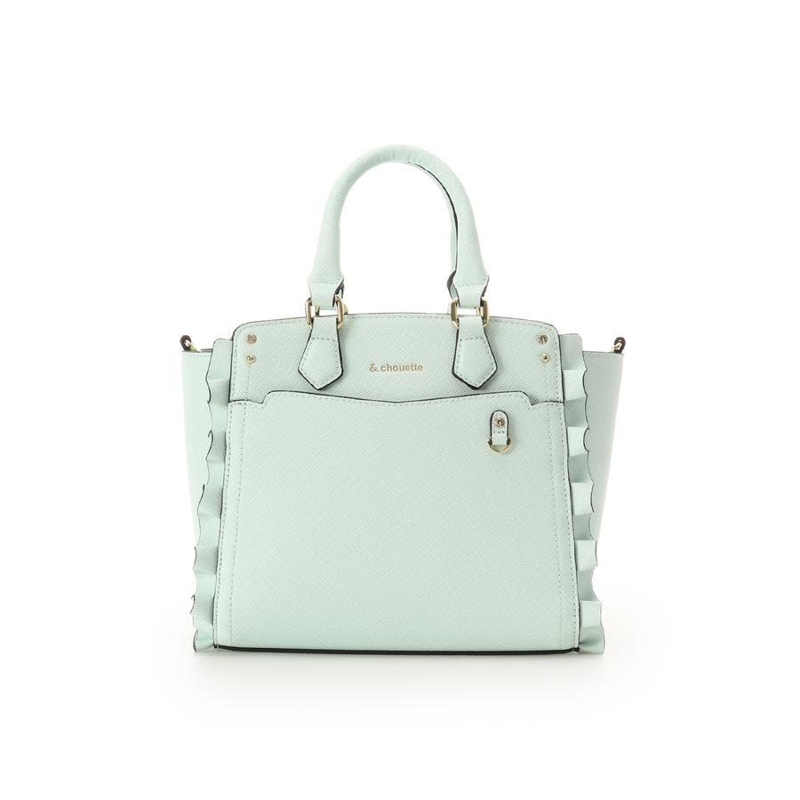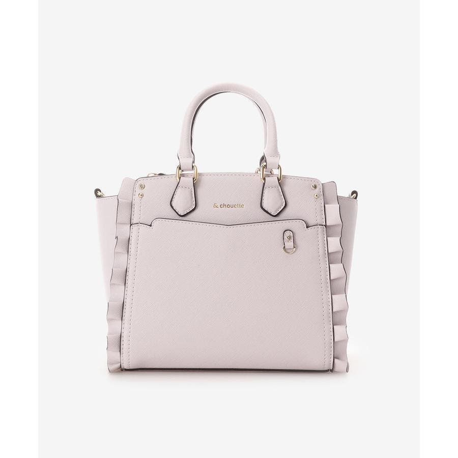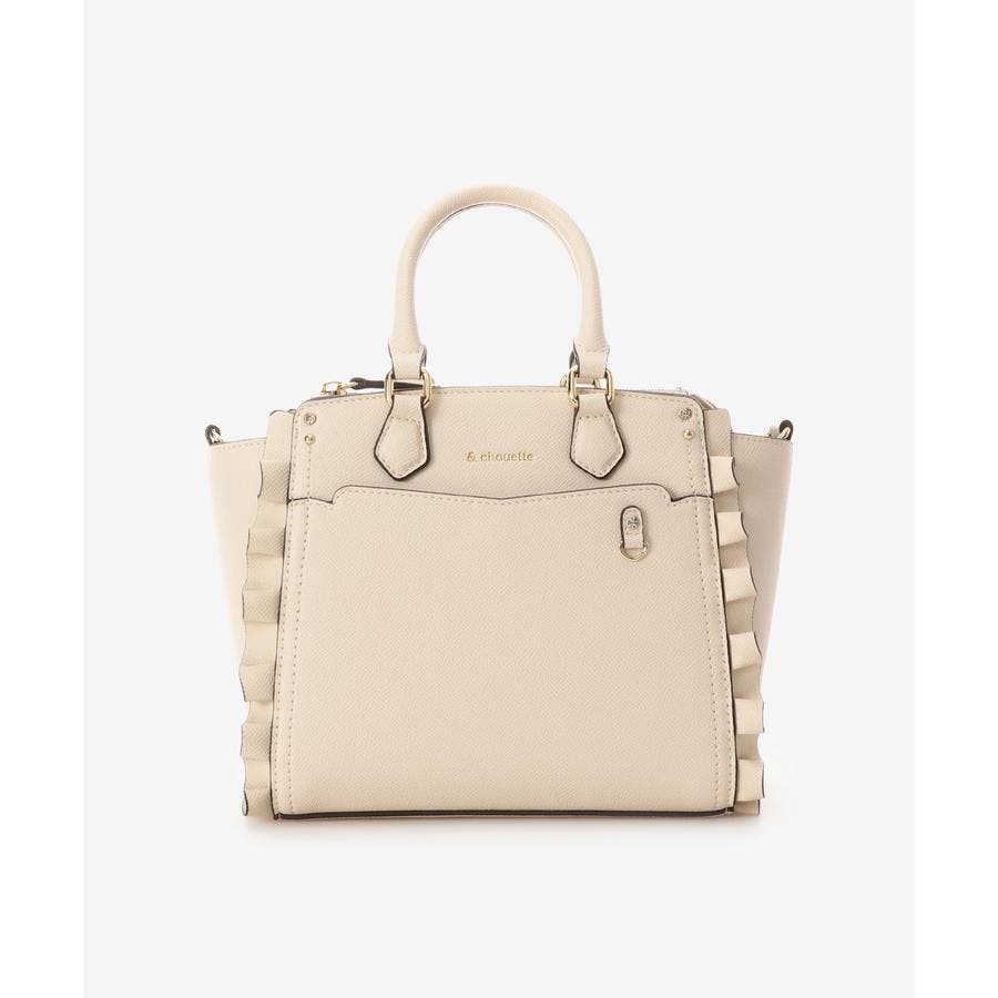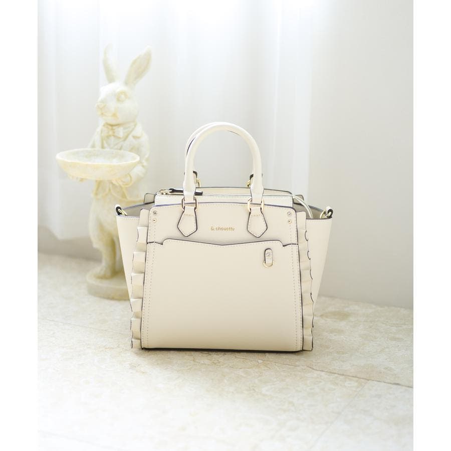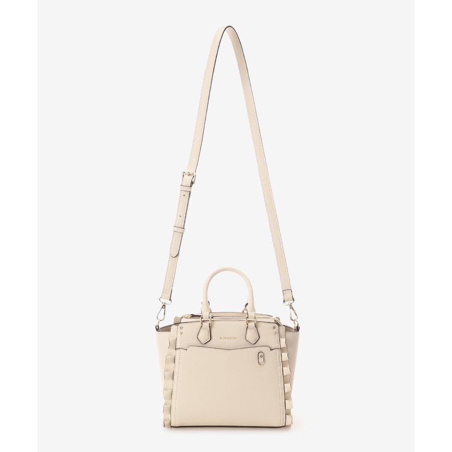 ささやかなフリルやさり気ないビジューが可愛いハンドバッグ。