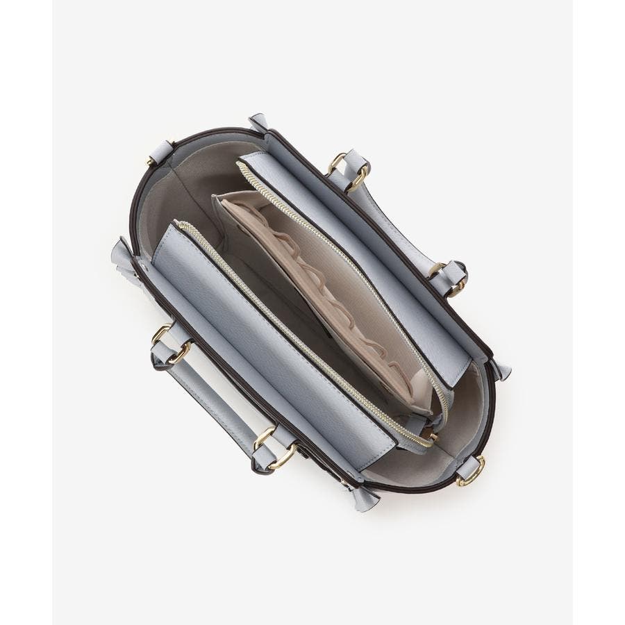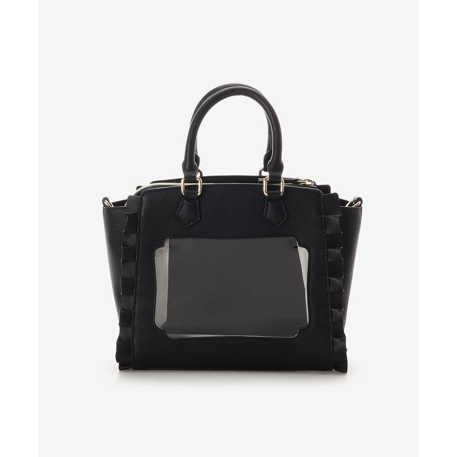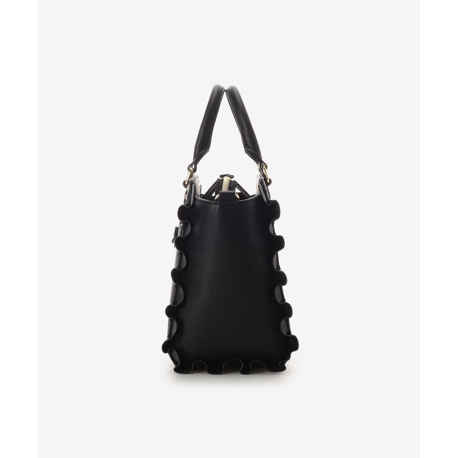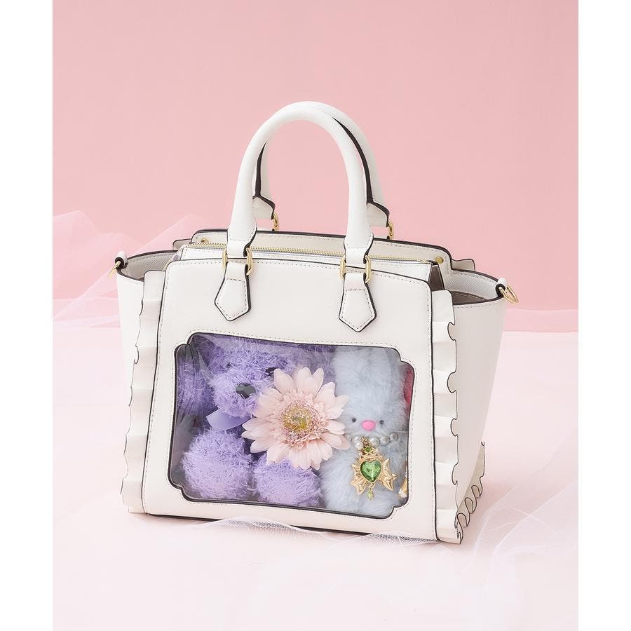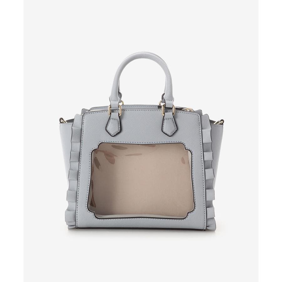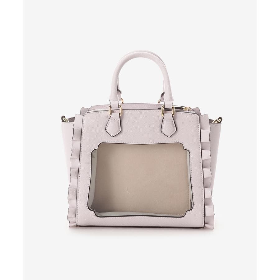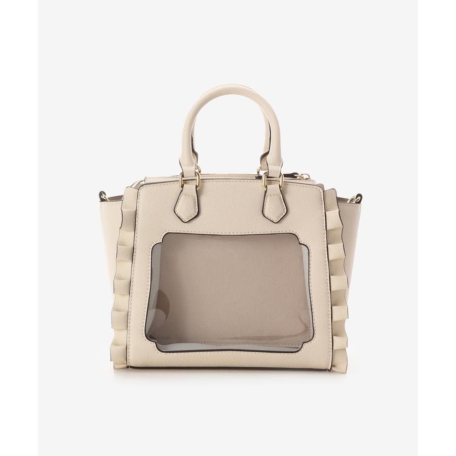 ささやかなフリルやさり気ないビジューが可愛いハンドバッグ。