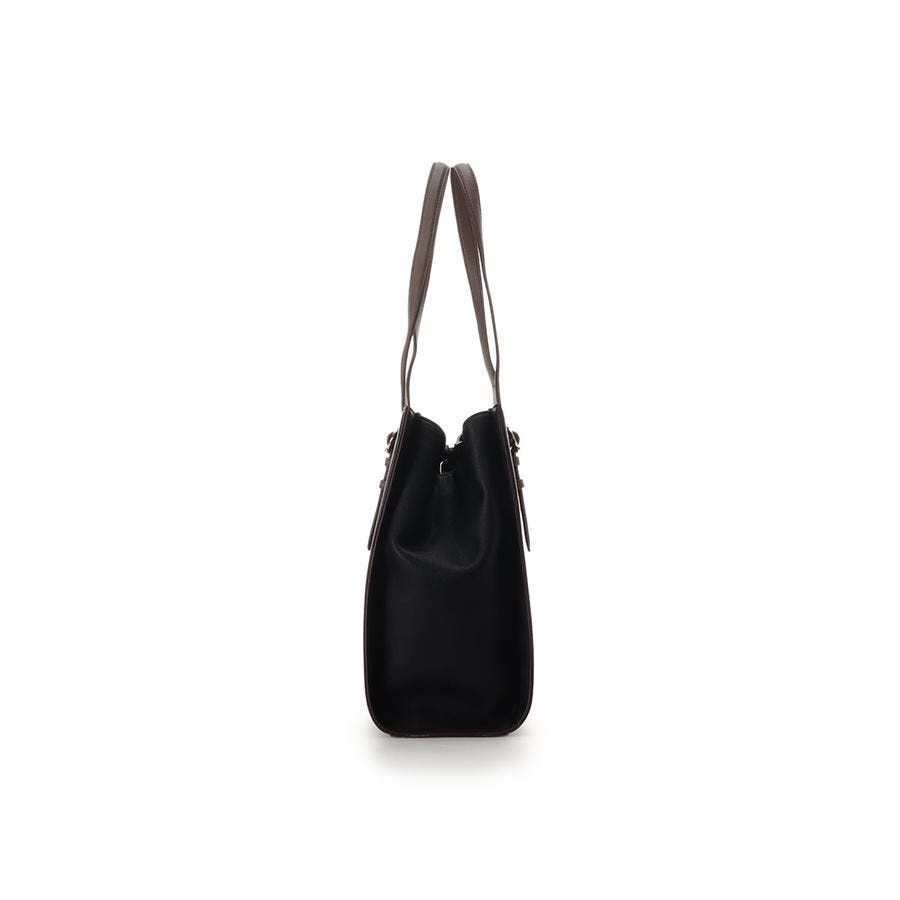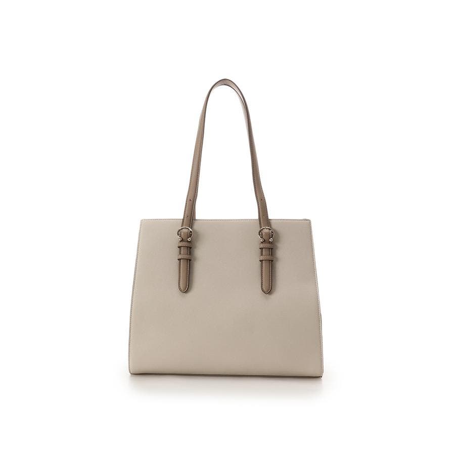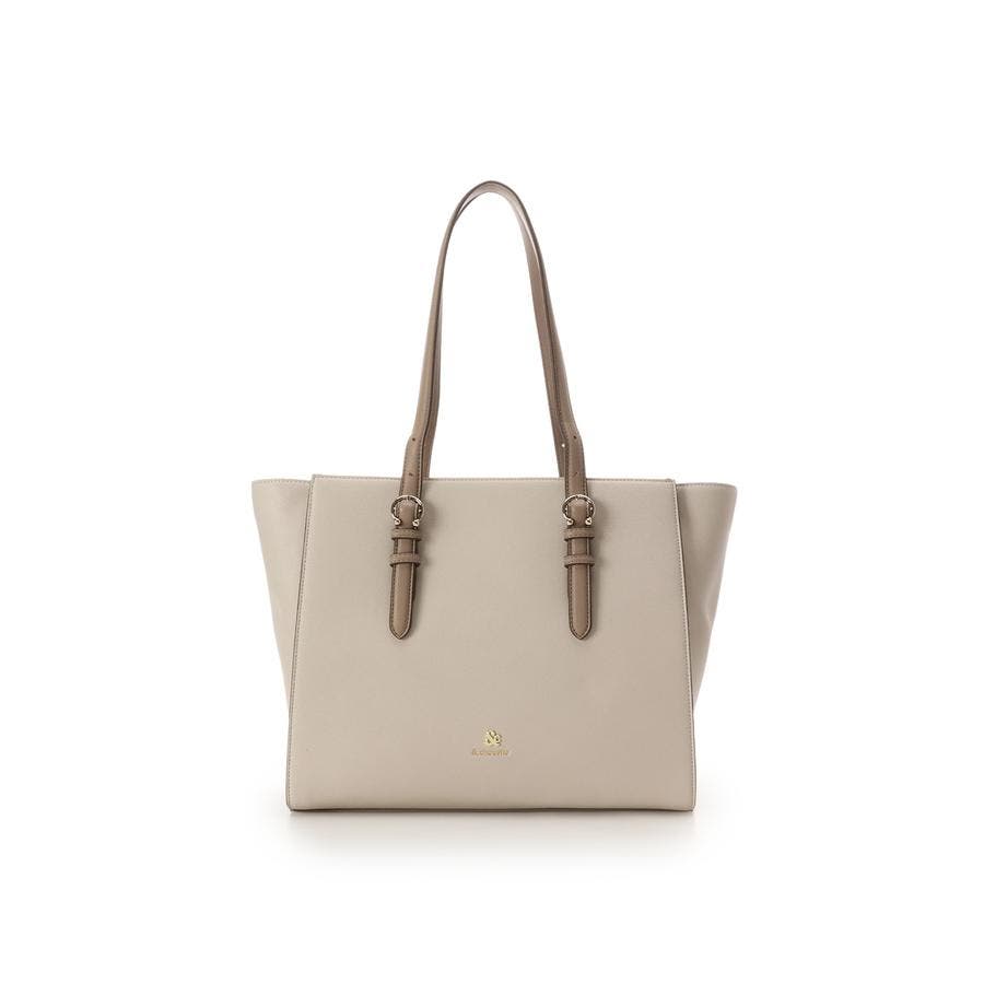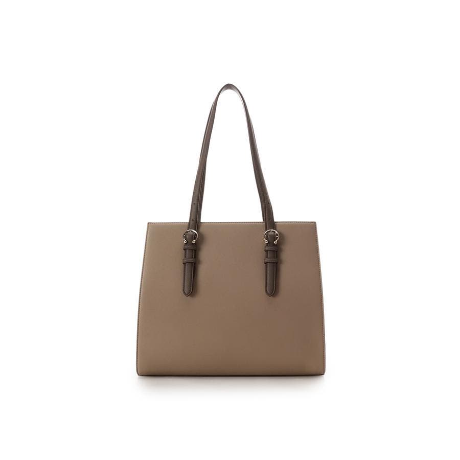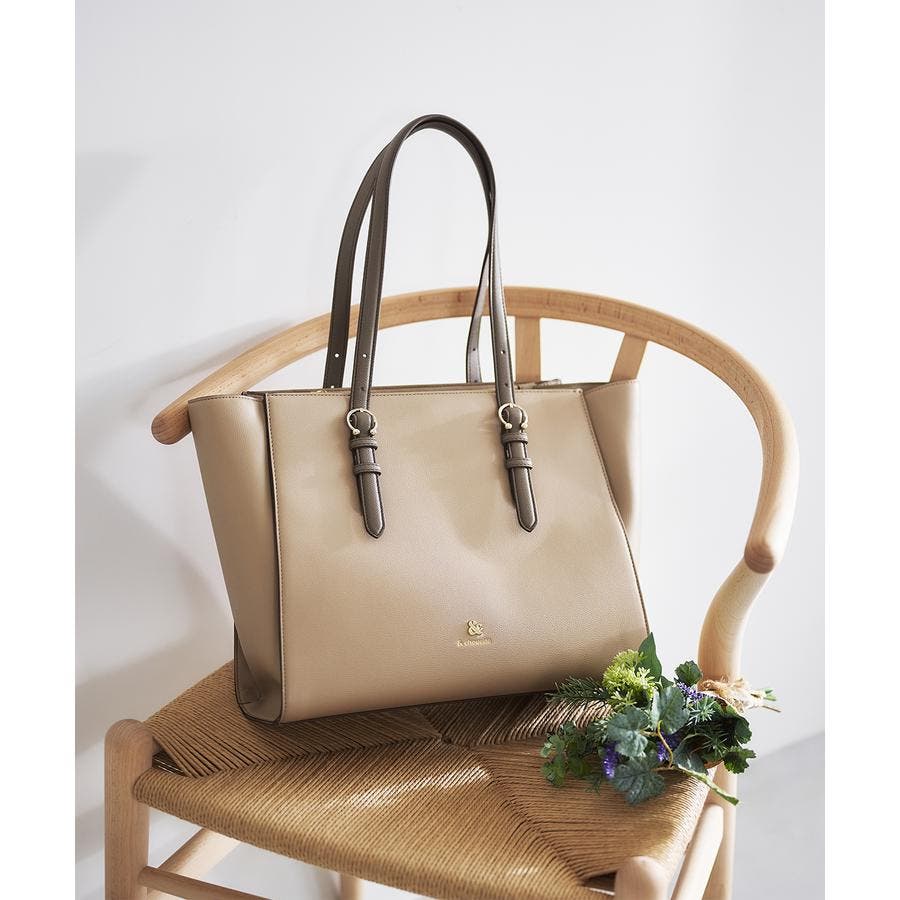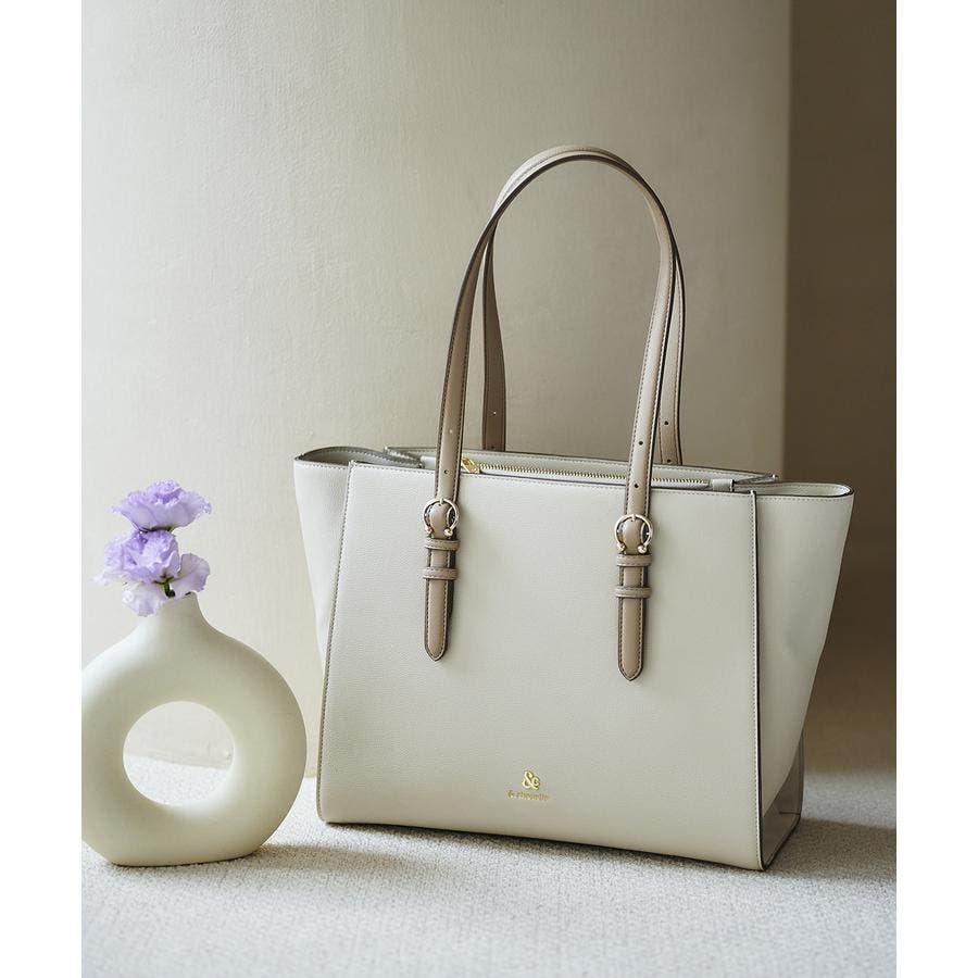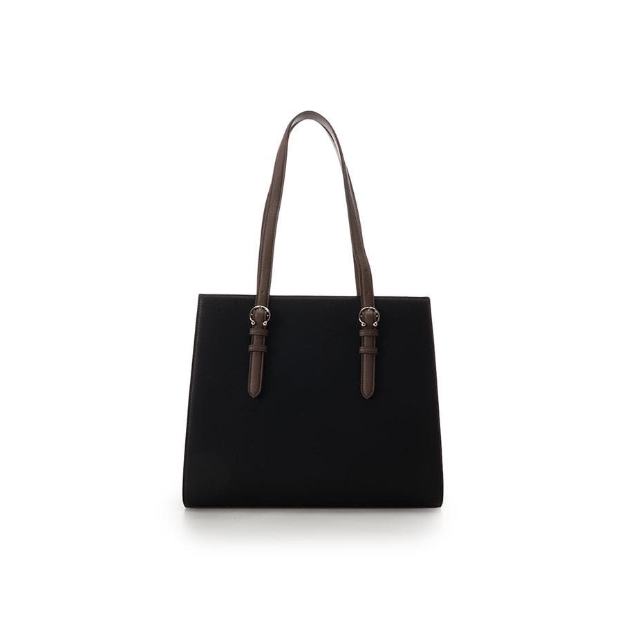 シンプルなデザインながらショルダーのベルトデザインときらりと光るアイコンモチーフがポイントのトートバッグです。