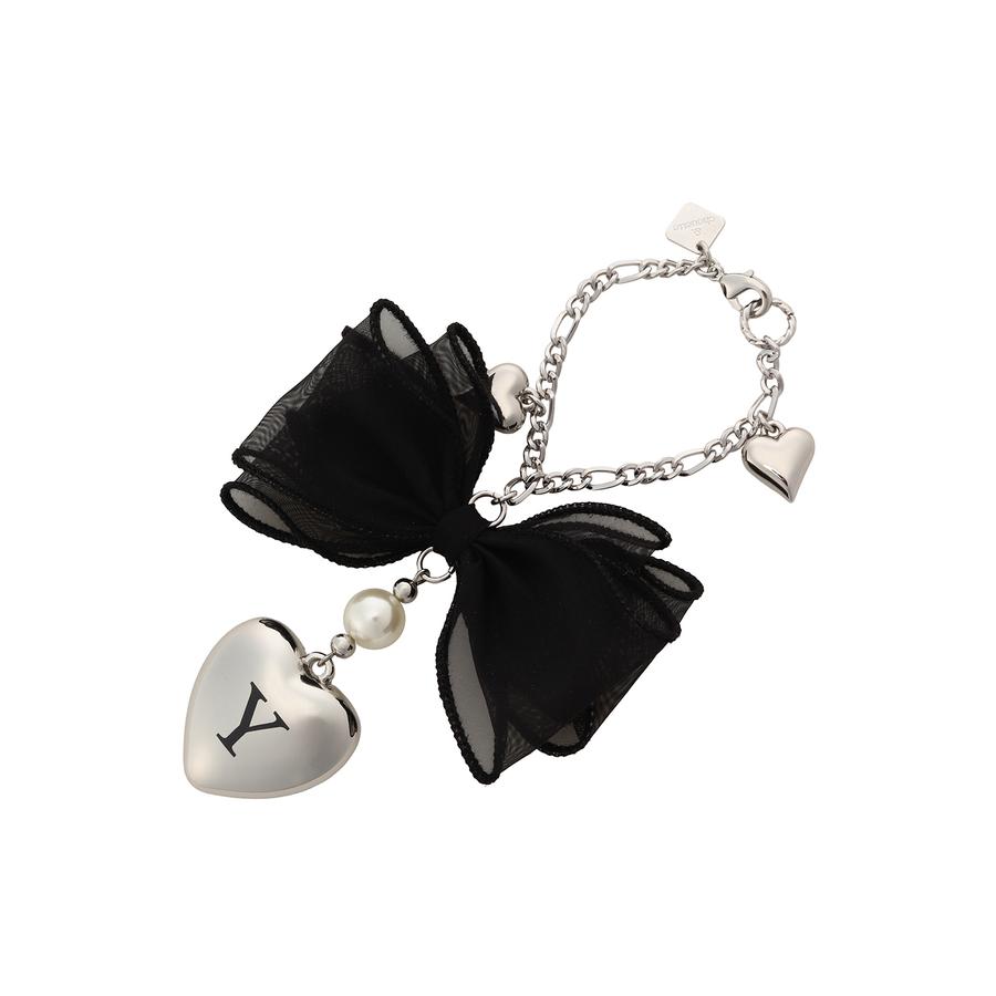 イニシャルの入ったハートに大きなリボンが付いたバッグチャーム。