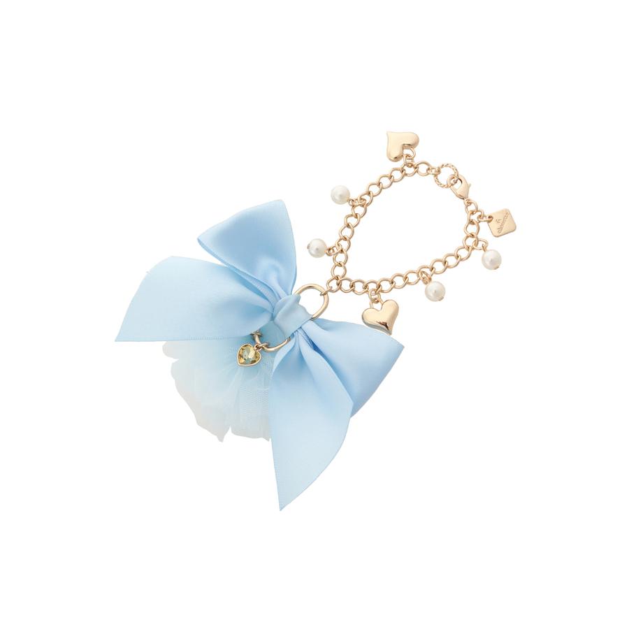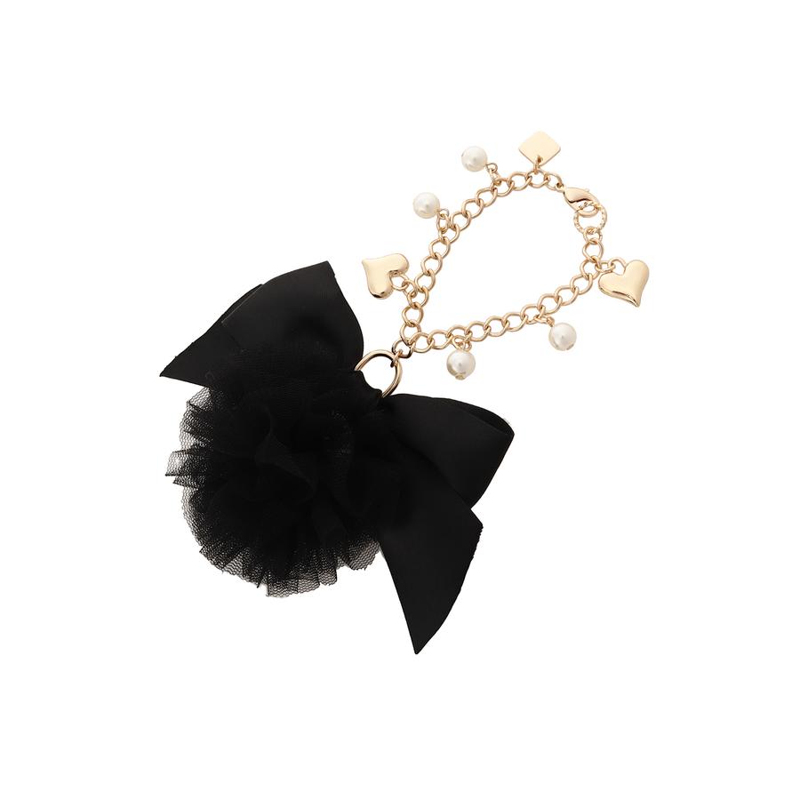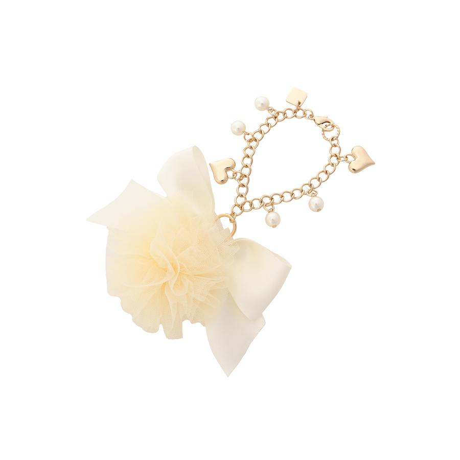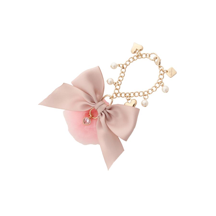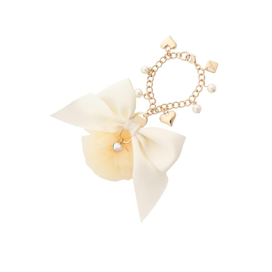 オーガンジー生地でポンポンを作り、存在感のある大きめのサテンのリボンとハートのビジューを組み合わせた華やかで可愛らしいバッグチャーム。