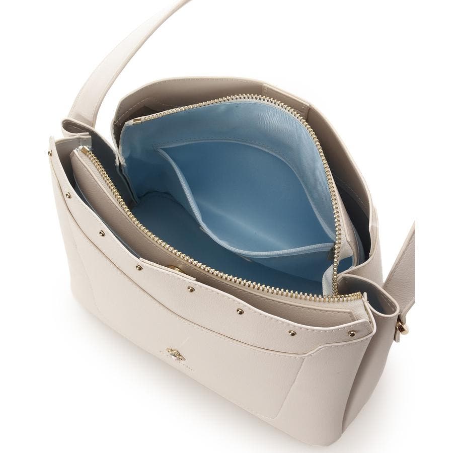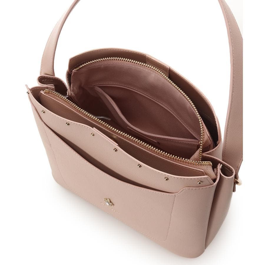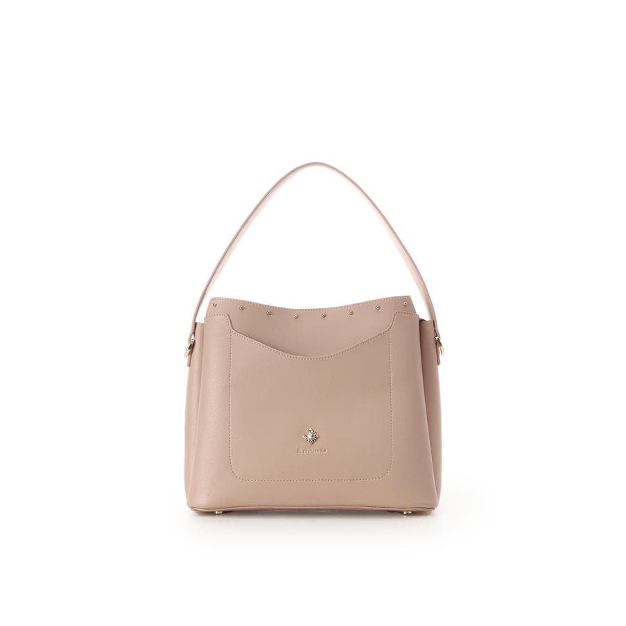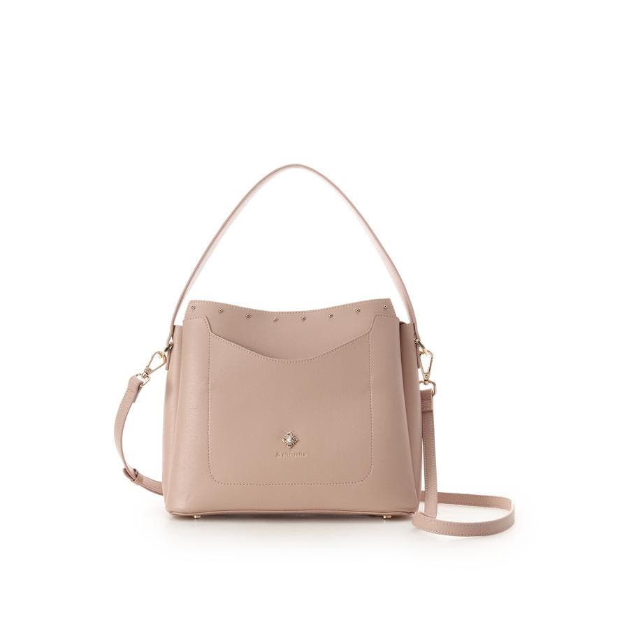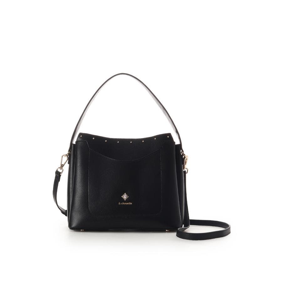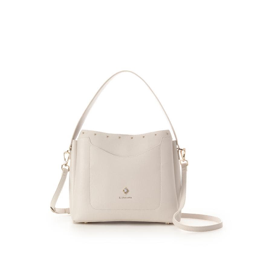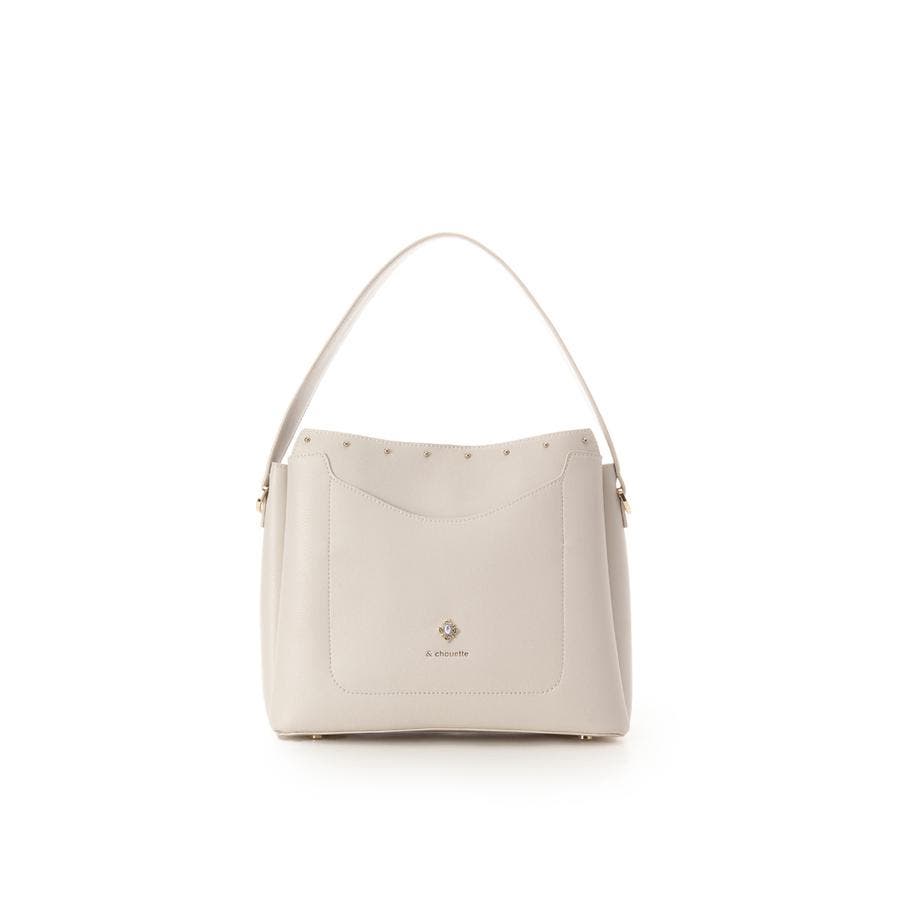 スタッズとワンポイントのビジューが付いて華やかな印象で、内側が3層に仕切られているセミハード合皮の一重仕立てバッグです。