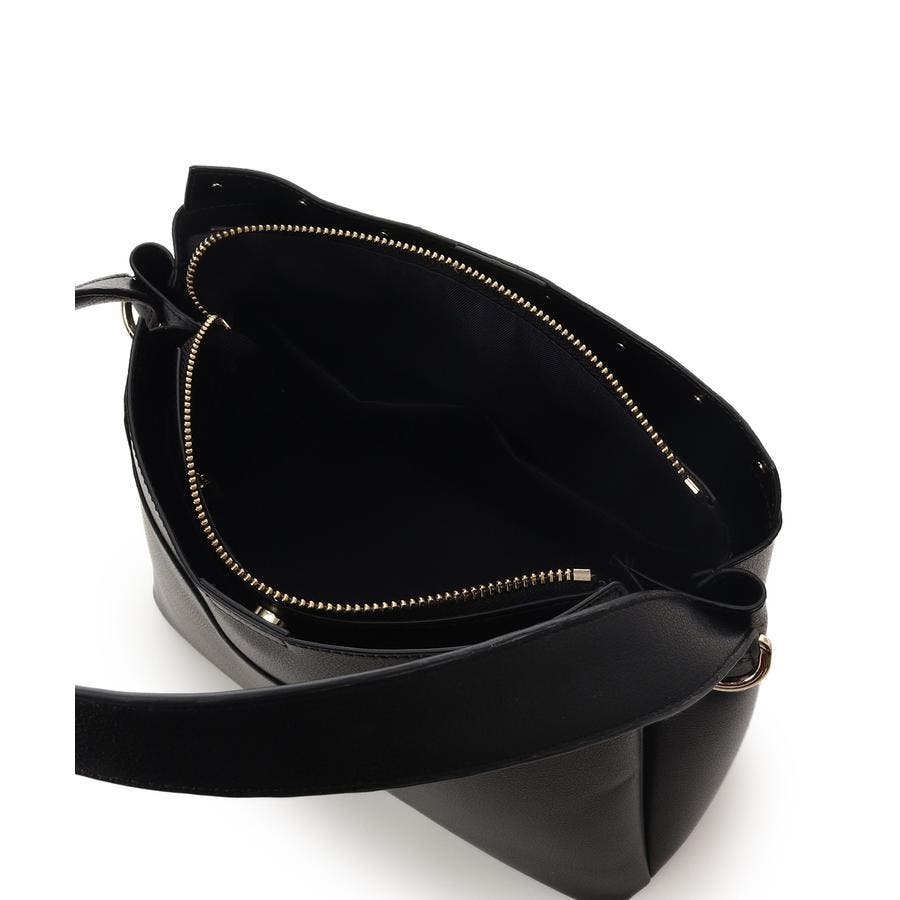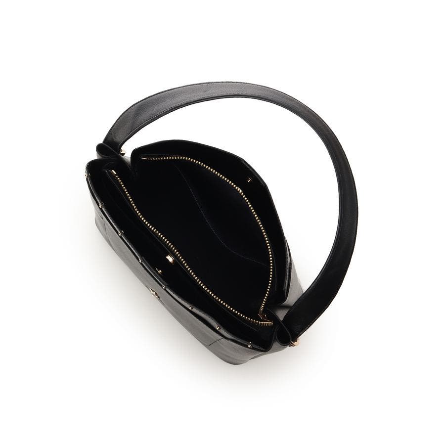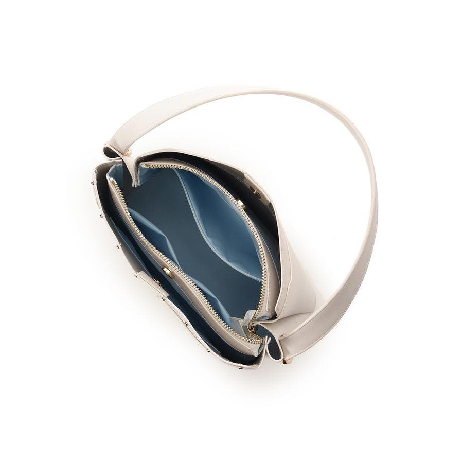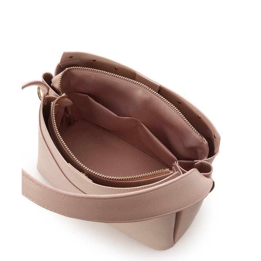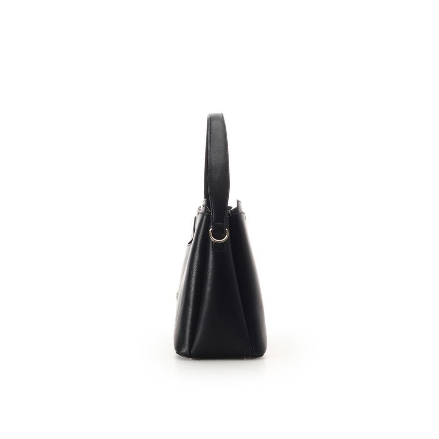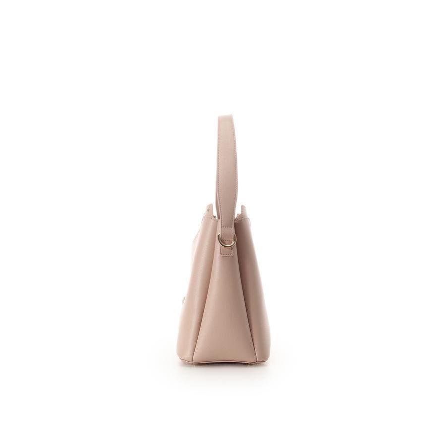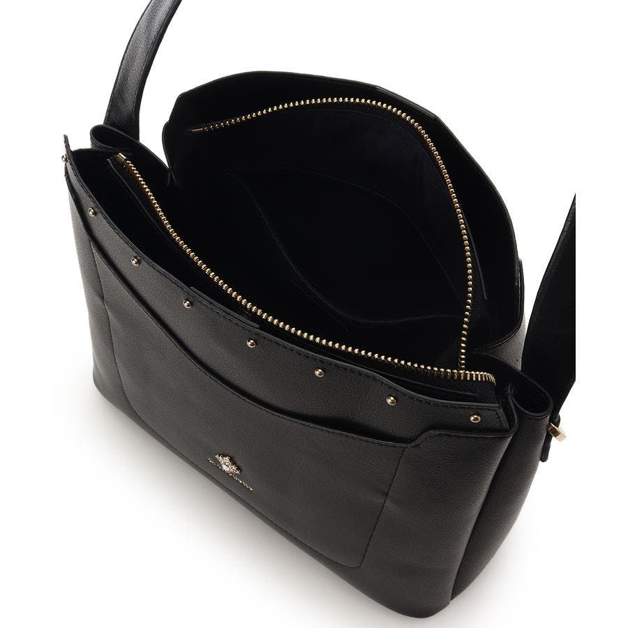 スタッズとワンポイントのビジューが付いて華やかな印象で、内側が3層に仕切られているセミハード合皮の一重仕立てバッグです。