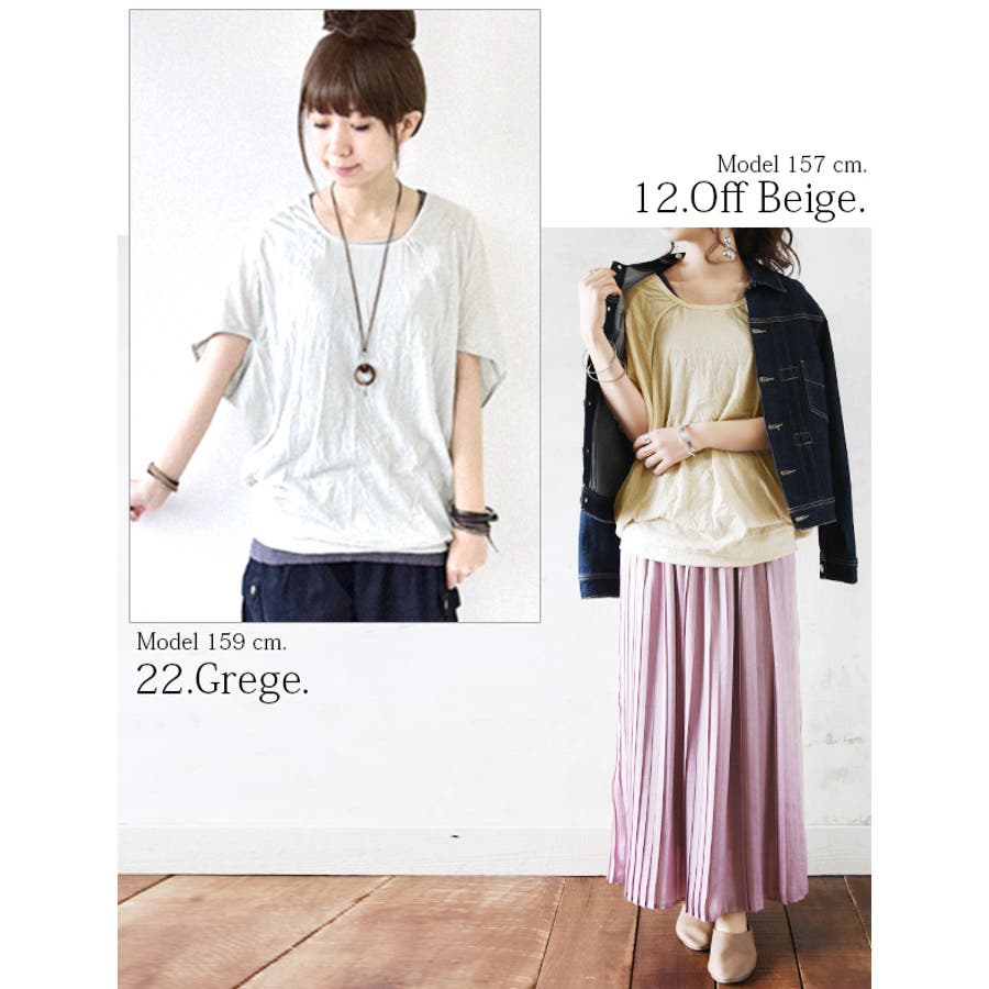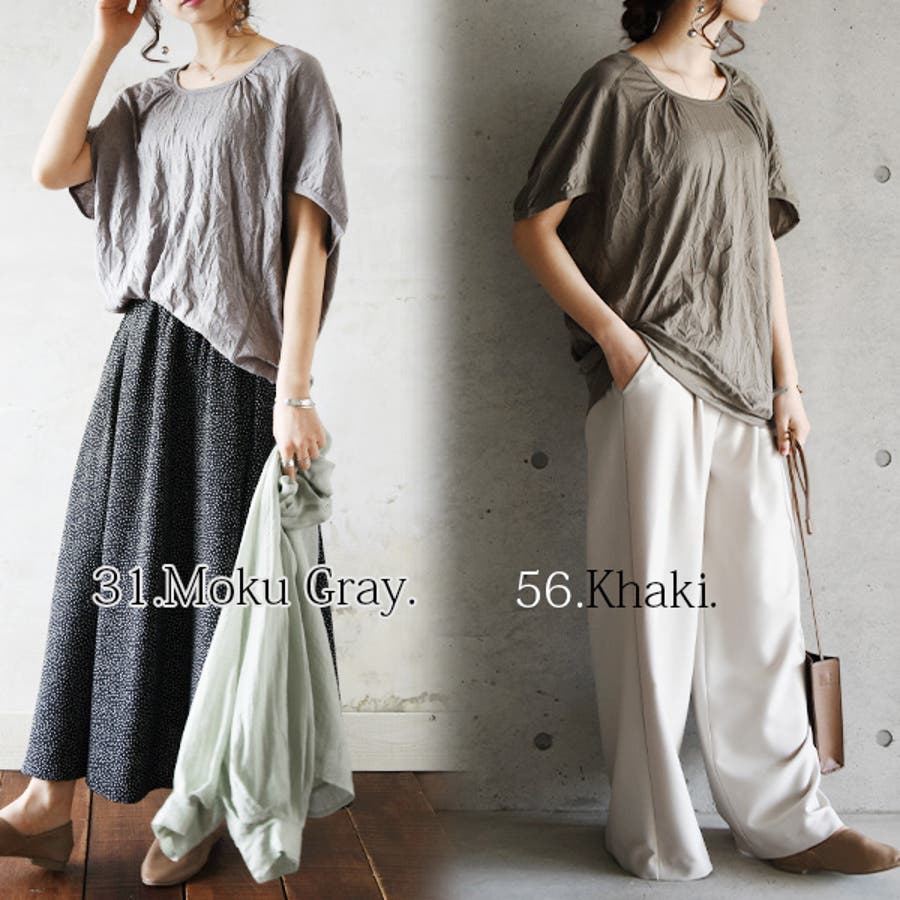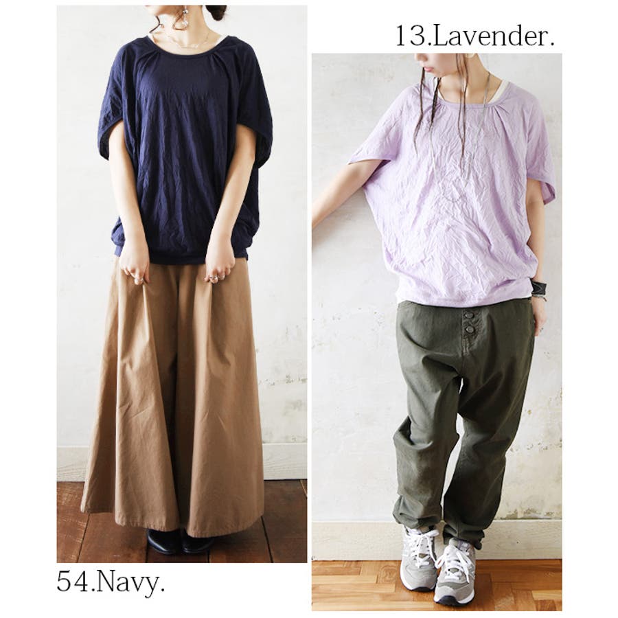 広めネックだから重ね着しやすくて着回し力が違います◎袖がワイドで腕周りもかなり楽ちん♪人気のくしゅくしゅ加工がポイント!ロング丈なのでブラウジングさせたりふっくらシルエットを作れば簡単に可愛く体型カバーも叶っちゃう!
