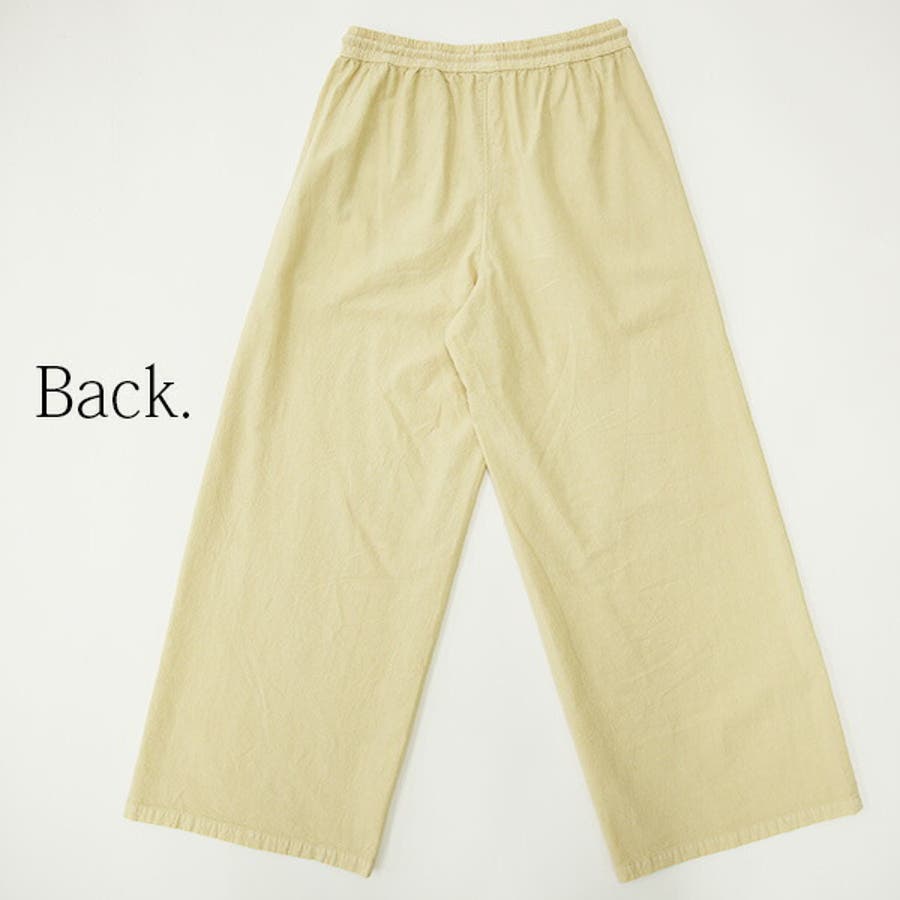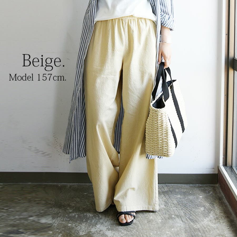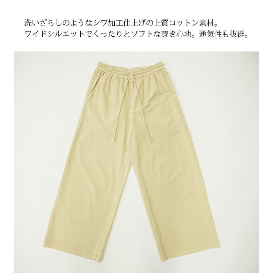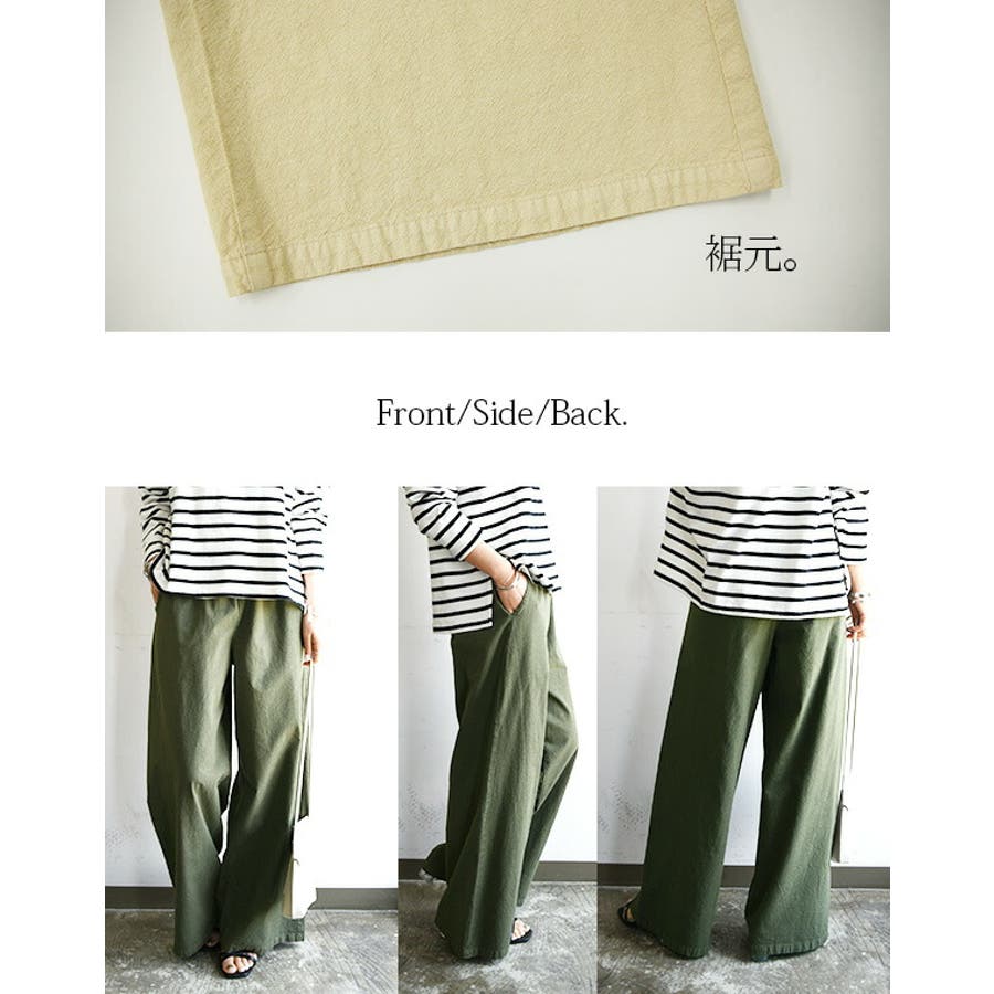 [M]サイズ着用。ウエストで穿いて、着丈はくるぶしより少し長いぐらいでした。ウエストは総ゴム仕様になっていて、リラックスして穿けます。フロントにストリングがデザインされているので自分のサイズに調整する事も出来ます。ナチュラルなコットン100%生地だから軽くて涼しい着用感がこれからの季節のボトムとして◎