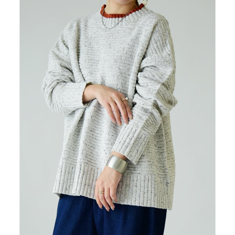 ネップ素材が目を惹く首元のカラーの配色がポイントのニット。存在感があり、着るだけでトレンド感がアップ。ゆったりとした着心地で体型カバーも叶います◎