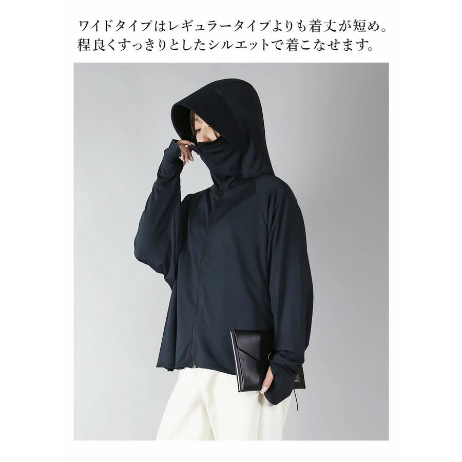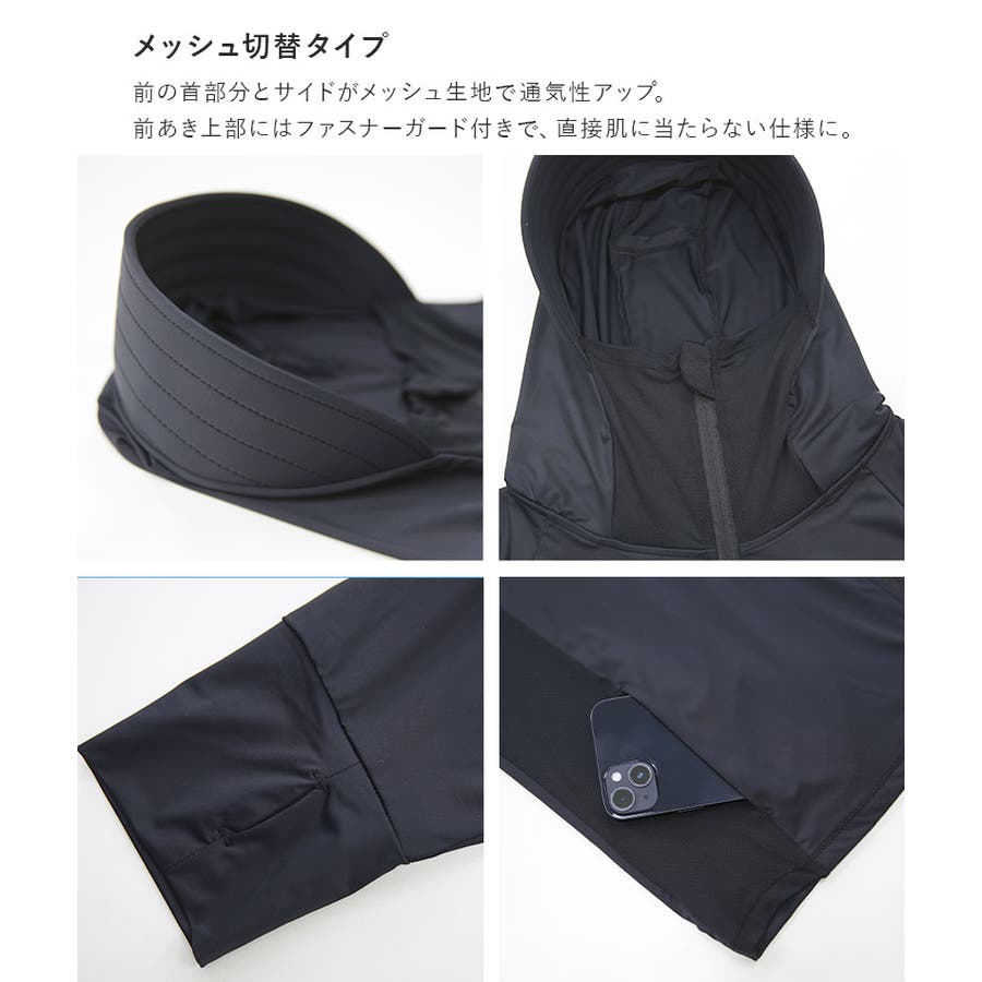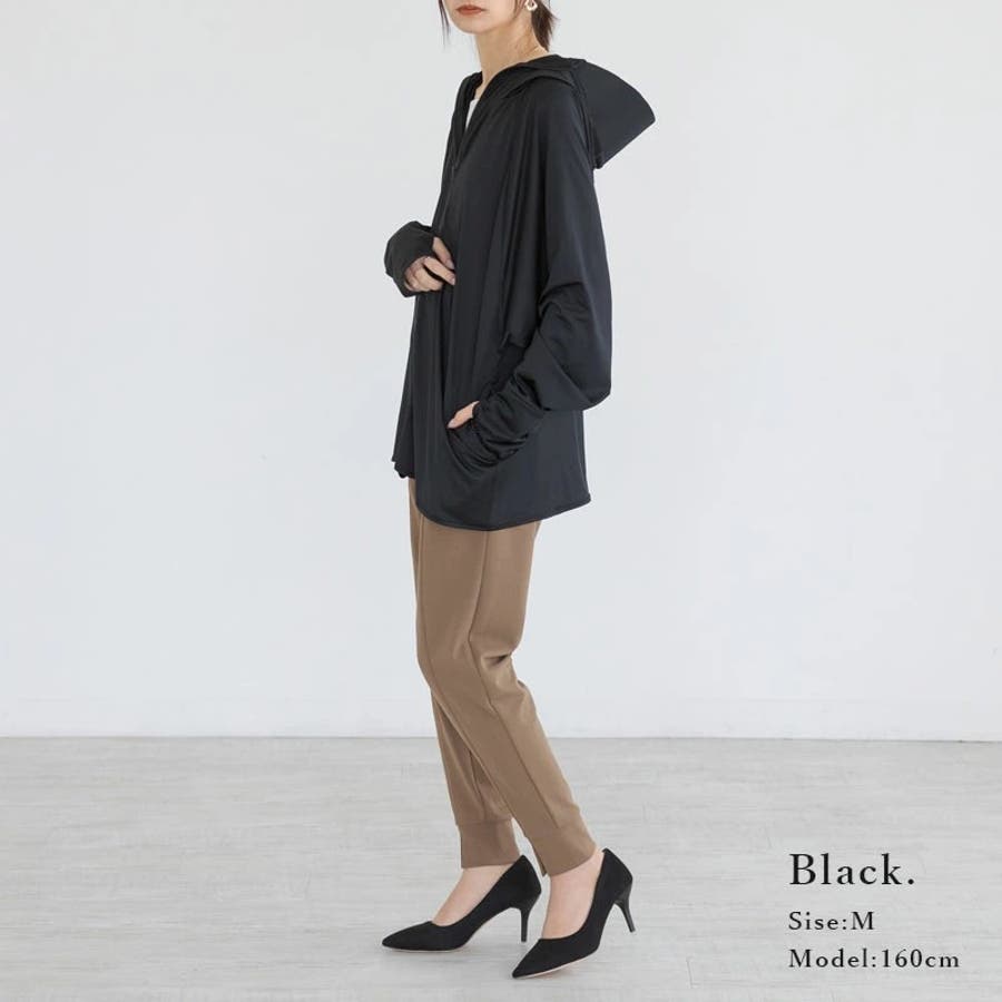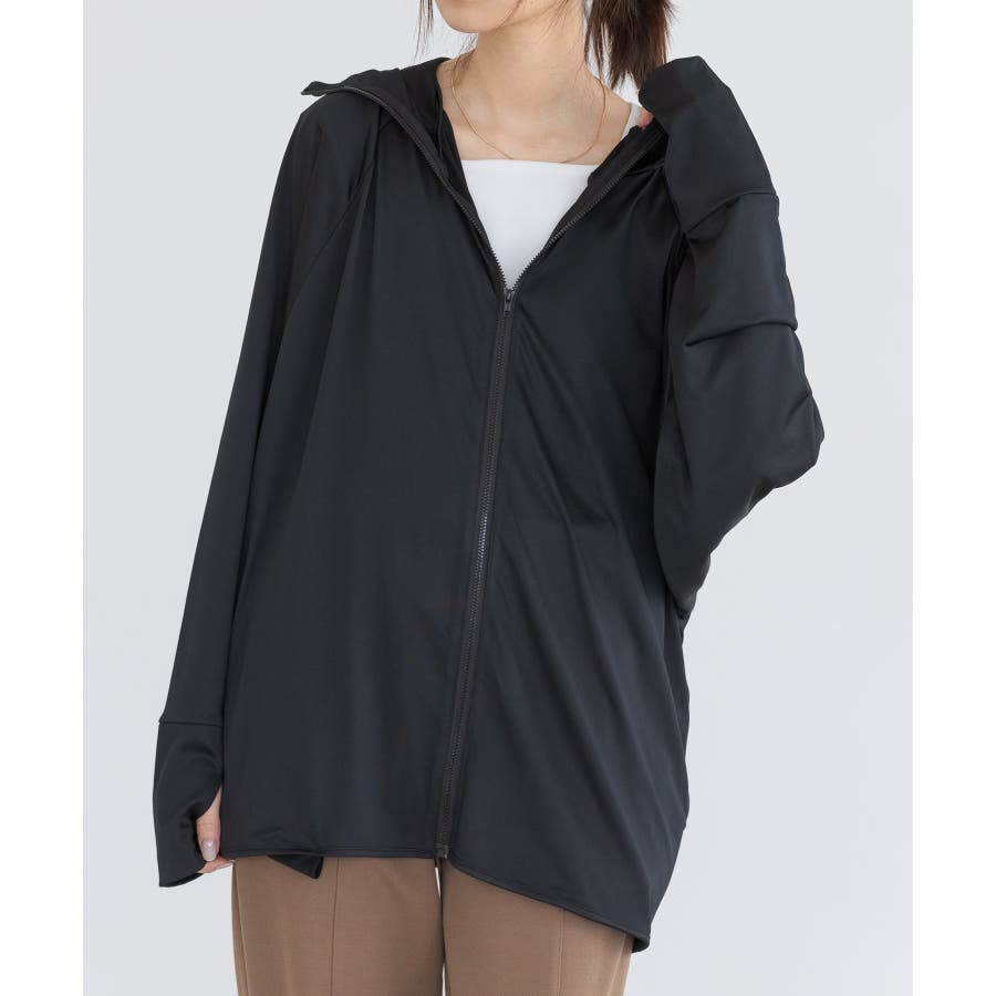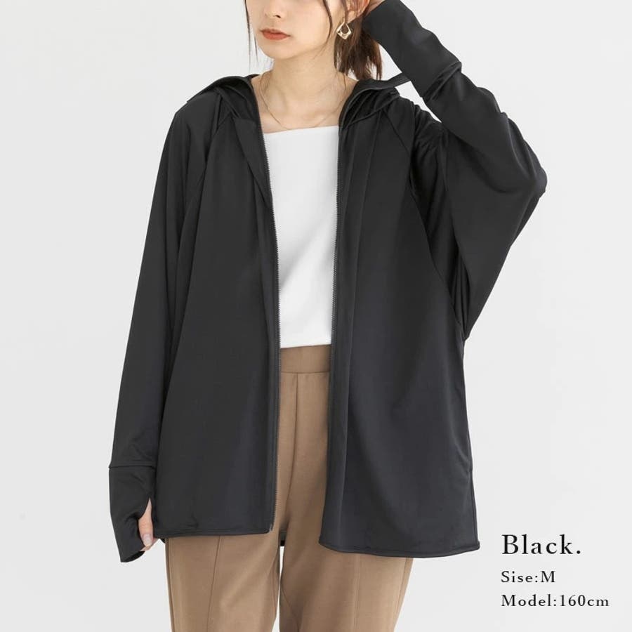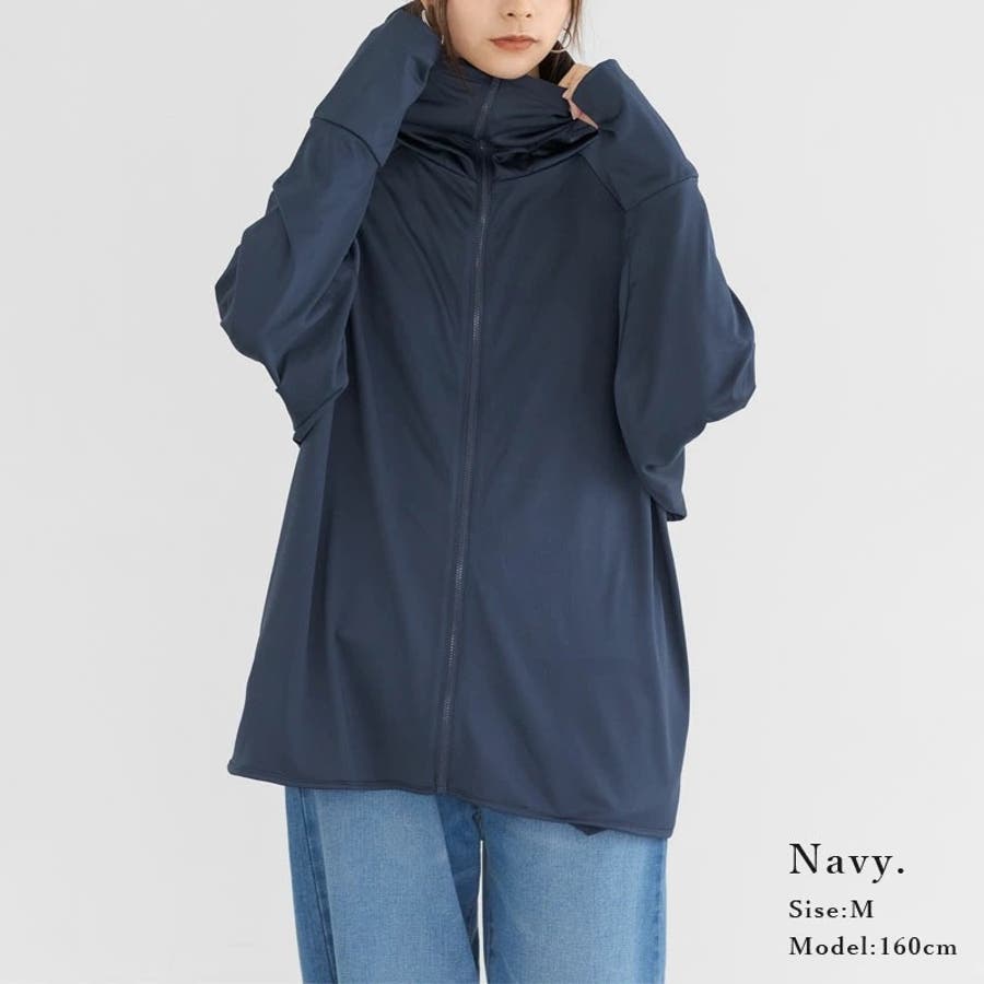 ひんやり接触冷感素材。つば付きフード・顔がしっかり隠れるハイネック・手の甲まで隠せる指穴付きで徹底的に紫外線対策ができるデザインです◎おしゃれなドルマンスリーブで着心地も楽ちん♪