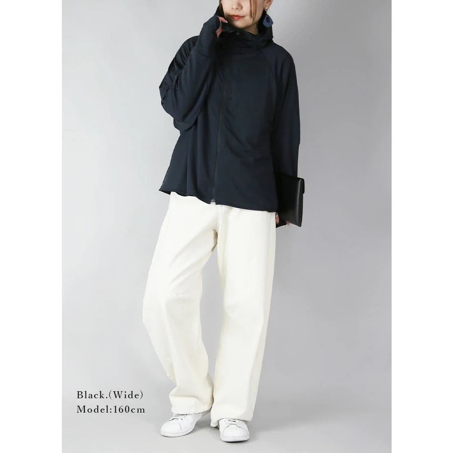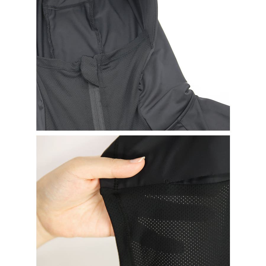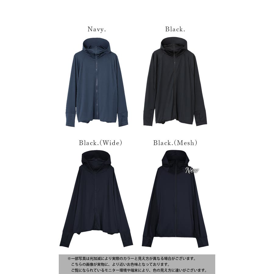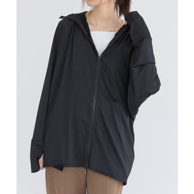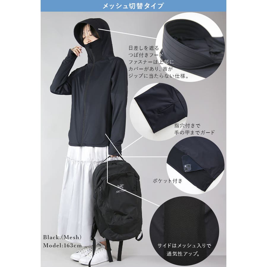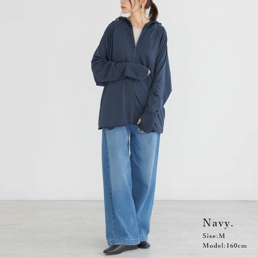 ひんやり接触冷感素材。つば付きフード・顔がしっかり隠れるハイネック・手の甲まで隠せる指穴付きで徹底的に紫外線対策ができるデザインです◎おしゃれなドルマンスリーブで着心地も楽ちん♪