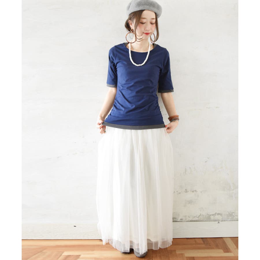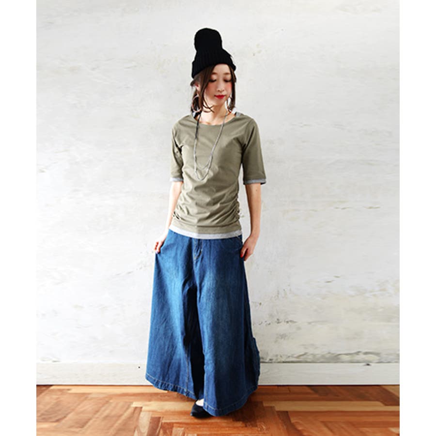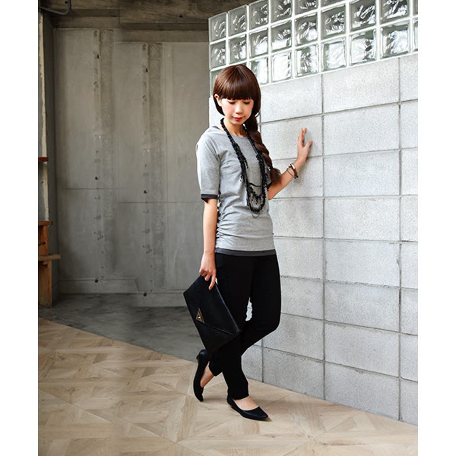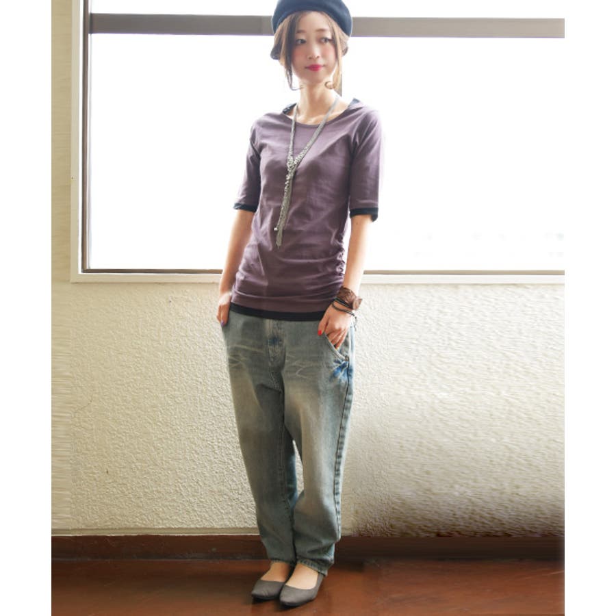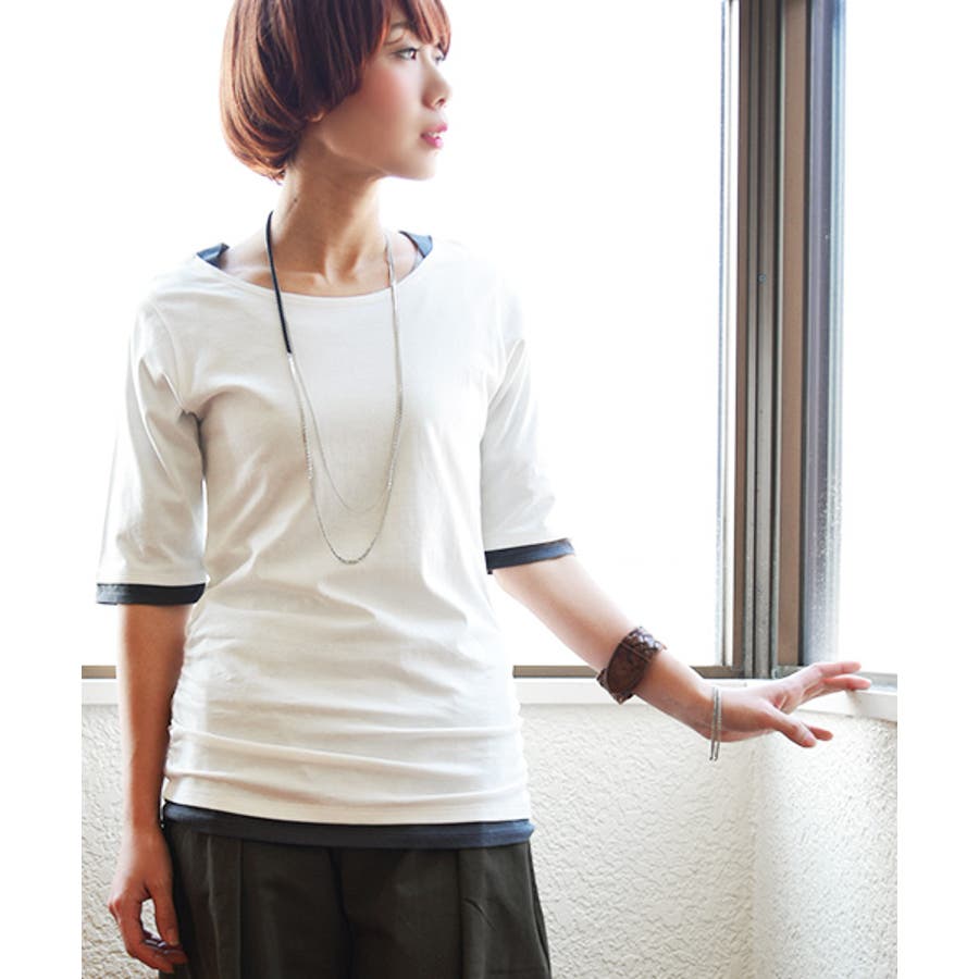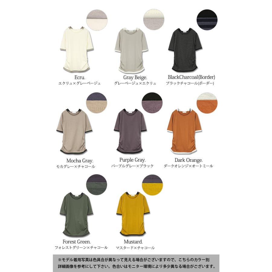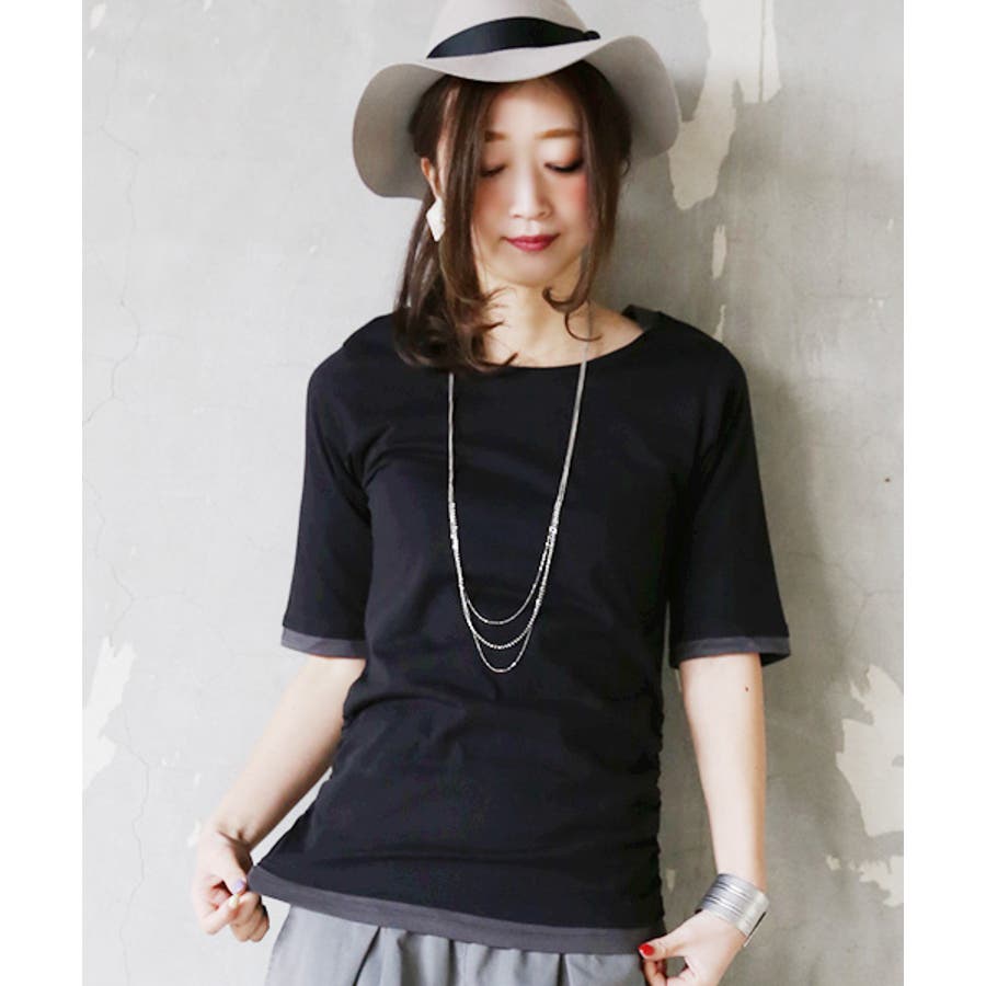 【M~4L】フェイクレイヤードくしゅくしゅシャーリング5分袖コットンカットソー♪…