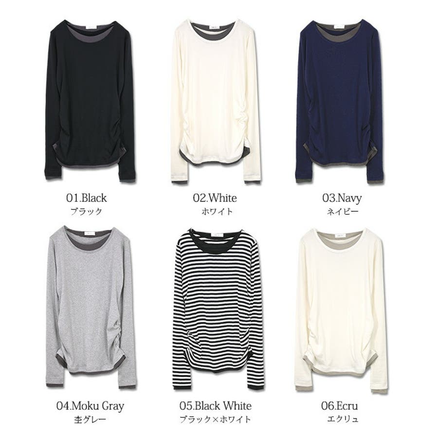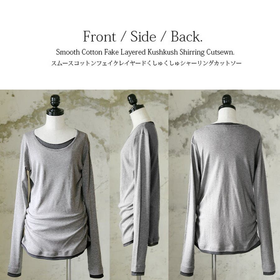 【M~4L】スムースコットンフェイクレイヤードくしゅくしゅシャーリングカットソー…