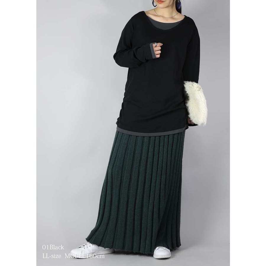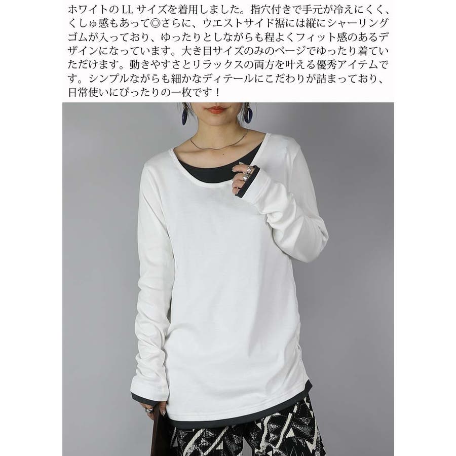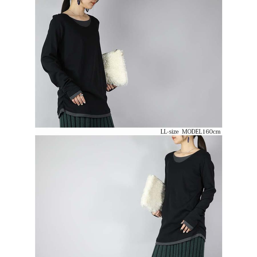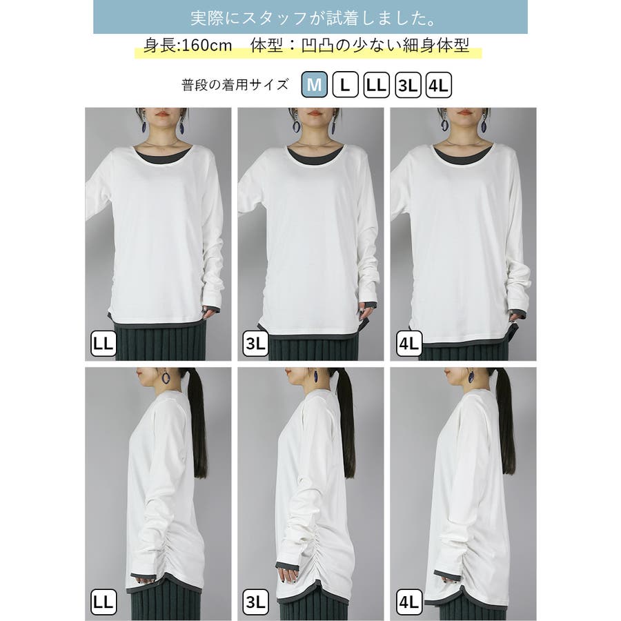 [LLサイズ]と[3Lサイズ]を着用。 [LL]着丈はお尻よりも5cmくらい下の長さでした。袖丈は伸ばすと手先より3cmくらい下の長さに。ゆったりと楽ちんなサイズ感です。サイドのシャーリングデザインがシルエットをまとめてくれて、裾元がもたつかないのが嬉しい◎[3L]着丈はお尻より7cm下くらい。ゆったりチュニック感覚で着られる丈感です◎大きめサイズで着るのがお好みの方におすすめです。色違いで揃えたい豊富なカラバリはとっても魅力的!