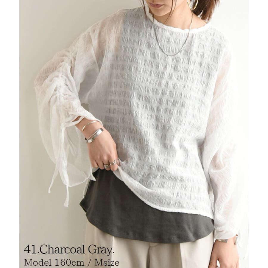 丈感が変わるので[L]サイズを着用。アームホールに余裕があるので腕を動かしやすかったです。着丈はお尻が半分弱くらい隠れました。身体のラインに沿わず締め付けを感じないので楽ちんでした!