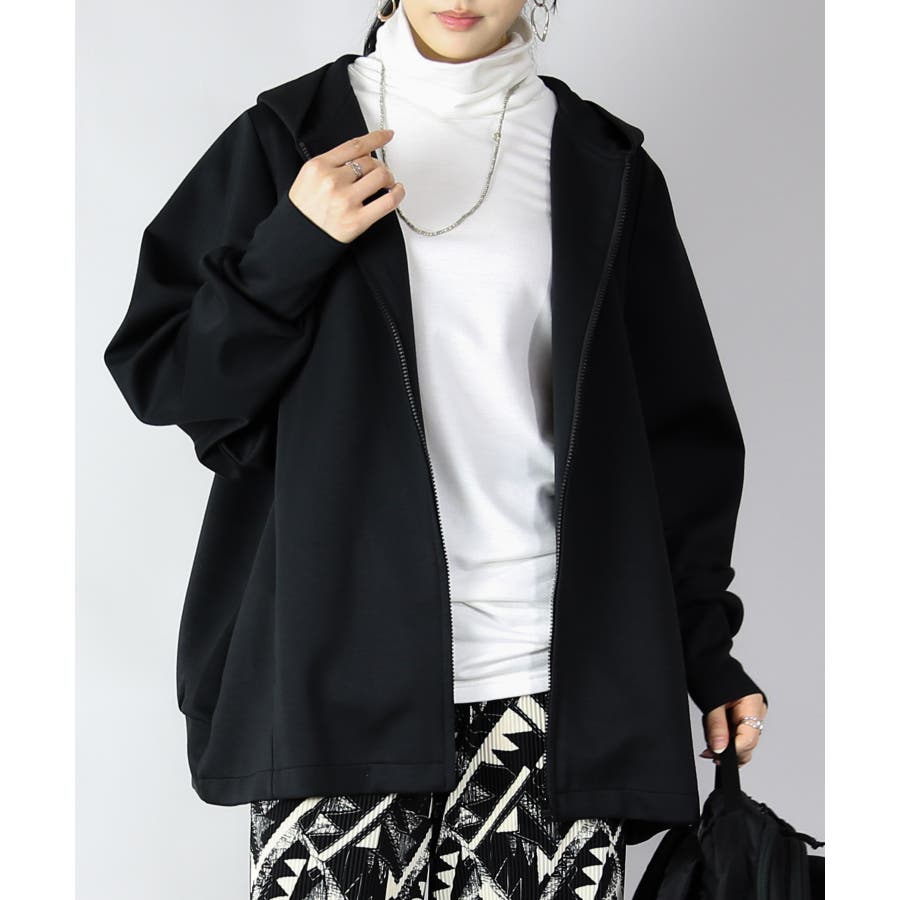 光沢感&ハリ感が上品見えするダンボールニット生地のフルジップパーカー。ゆったりとしたシルエットが抜け感のある雰囲気です。