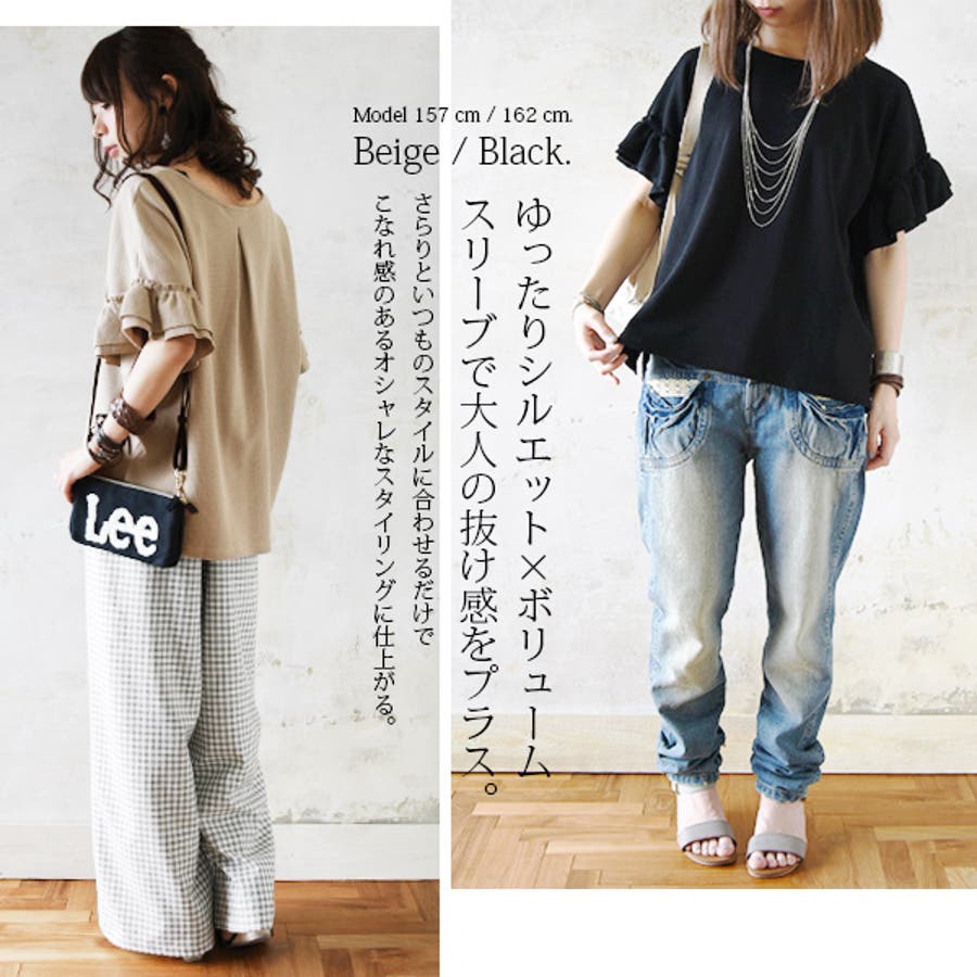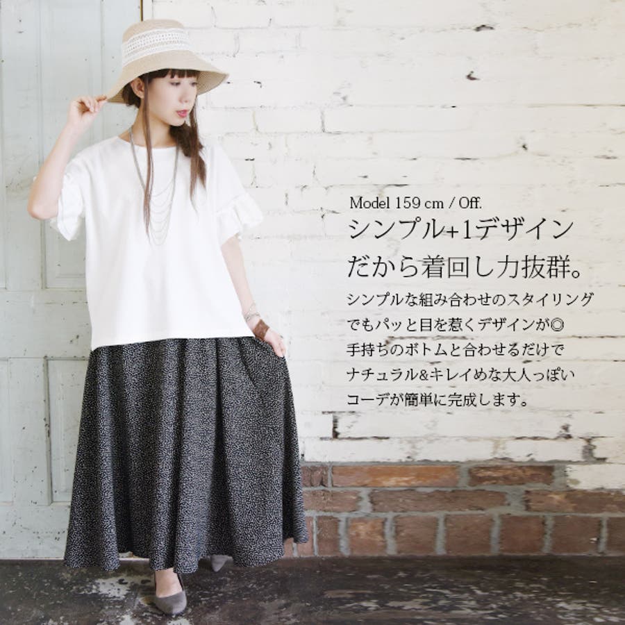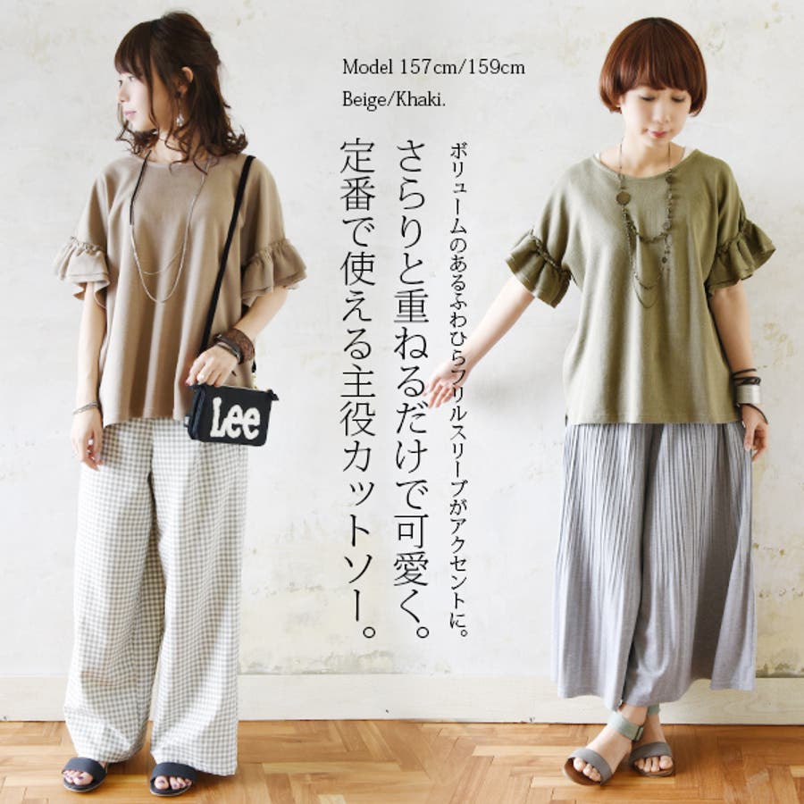 私が着ると着丈はお尻がほぼ隠れるくらいの長さでした。綿100%のワッフル素材を使用しているので、抜群の肌触り!暑い季節もさらりとデザイントップスが楽しめるのが嬉しいです!フリルスリーブもワッフル生地で甘さ控えめなのが◎袖丈はひじ上5cmくらいで、二の腕をほぼ隠してくれました♪