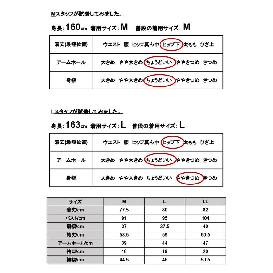 [L]着丈約80、バスト約95、肩幅約37.5、袖丈約59、AH約39、袖口約19、裾幅約46