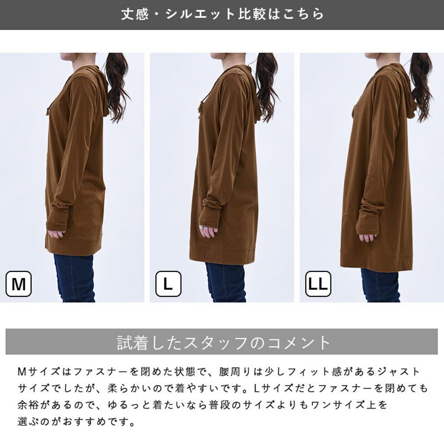 MサイズとLサイズ両方着用しました。 [M]ファスナーを閉めた状態でジャストサイズでした。丈の長さはお尻下10cmくらいで、袖の長さは手首を覆うくらいになりました。さらりと肌触りが柔らかい生地だからとっても着心地がよかったです♪ [L]丈はお尻下15cmくらい、袖は手の甲くらいの長さになりました。 ファスナーを閉めても裾周りに余裕があったのでゆるっと着たいならこちらのサイズをオススメします!