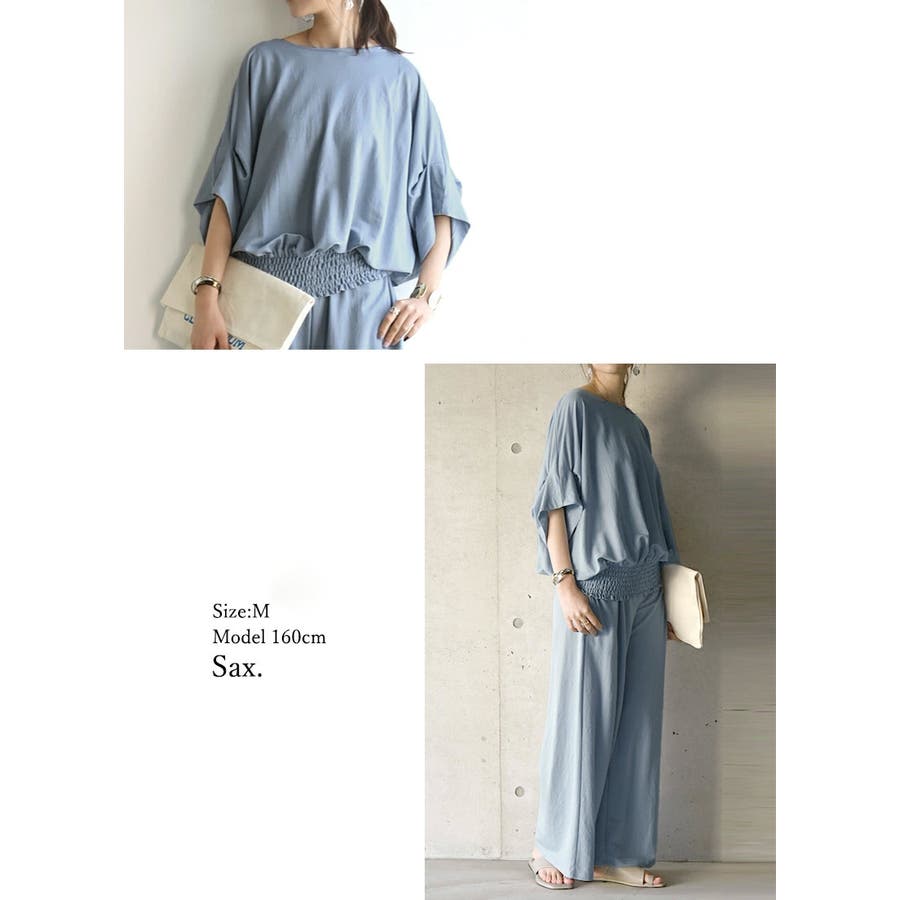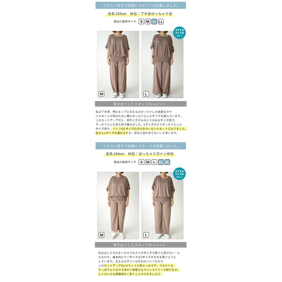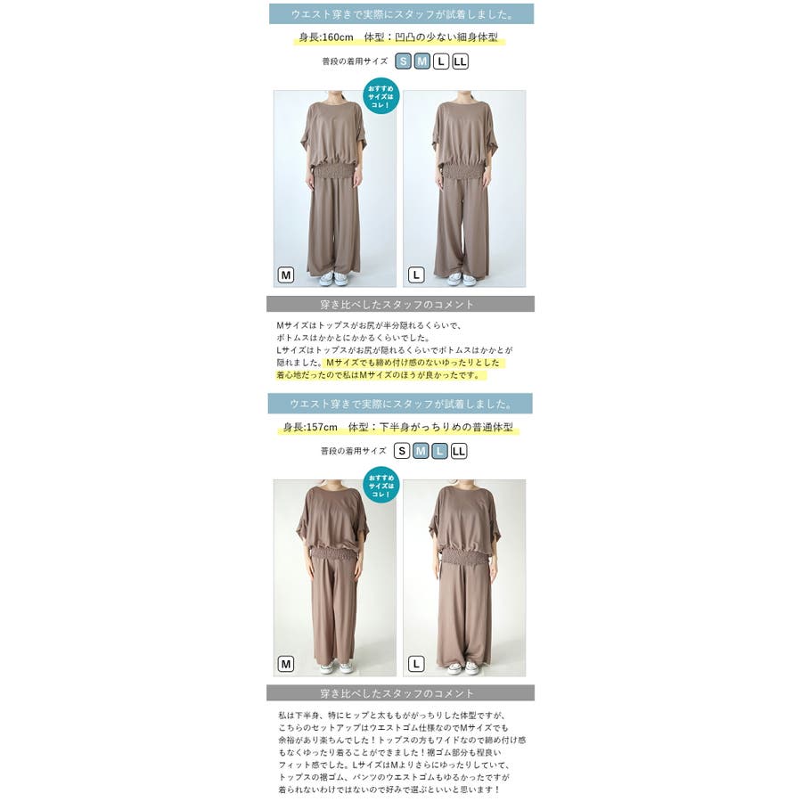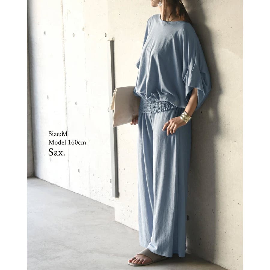 [Mサイズ]を着用。上下共にゆったりとラフなサイズ感。ひんやりとした着心地が快適なセットアップです♪トップスはシャーリングを伸ばすとお尻より5cm位の長さ、袖はひじを覆う丈感でした。裾のシャーリングゴムは締め付け感がなく、腰周りに優しくフィットしてくれます!ブラウジングしたり、好みの丈感にしやすいのが◎パンツはウエストゴムで楽ちん!着丈はウエストで穿いてくるぶしをすっぽりと覆うくらいでした。