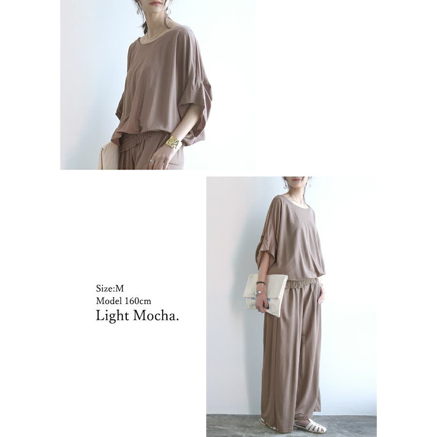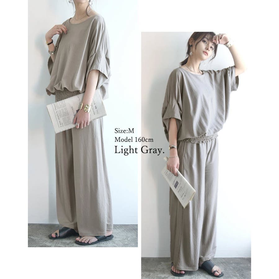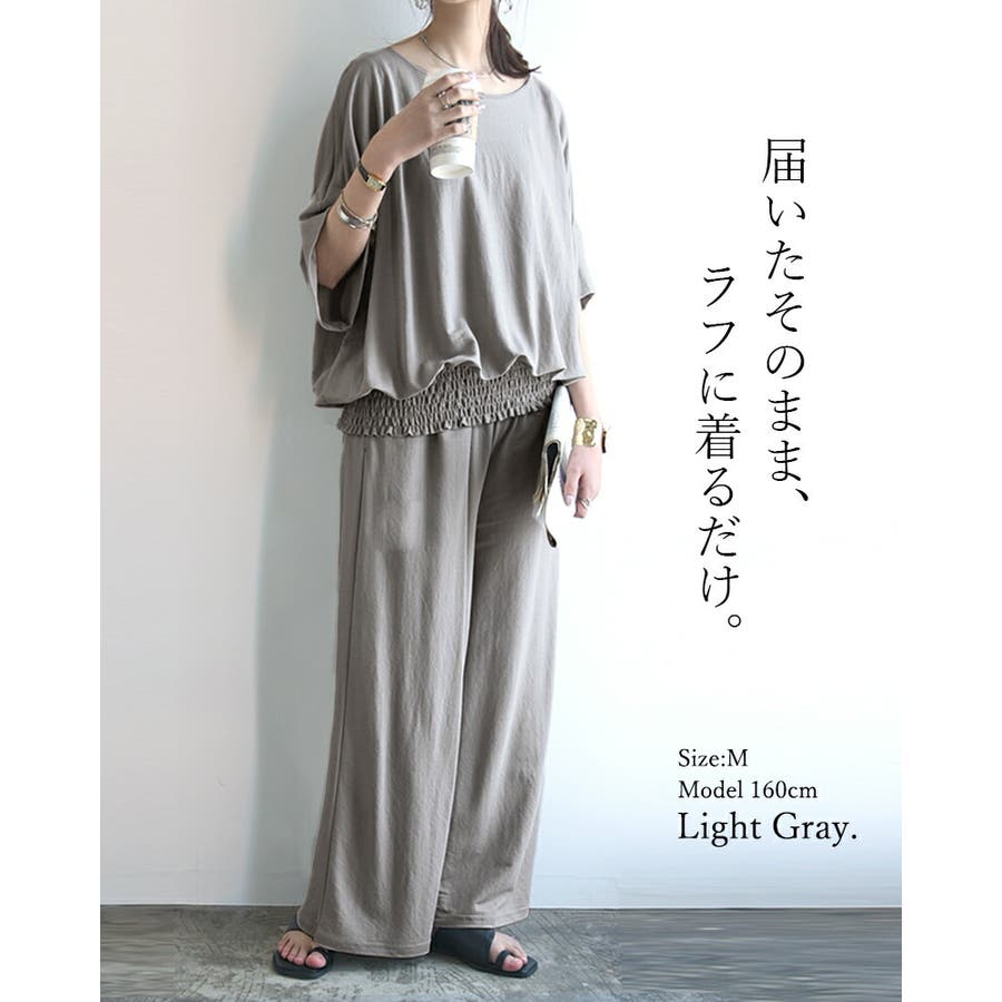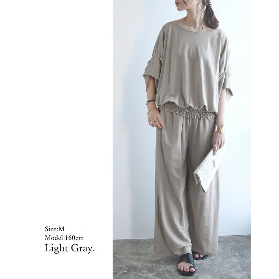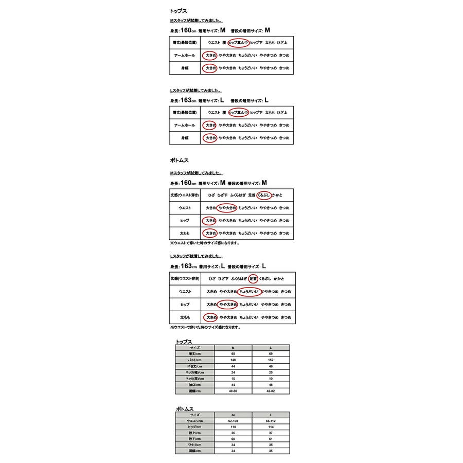 [Mサイズ]を着用。上下共にゆったりとラフなサイズ感。ひんやりとした着心地が快適なセットアップです♪トップスはシャーリングを伸ばすとお尻より5cm位の長さ、袖はひじを覆う丈感でした。裾のシャーリングゴムは締め付け感がなく、腰周りに優しくフィットしてくれます!ブラウジングしたり、好みの丈感にしやすいのが◎パンツはウエストゴムで楽ちん!着丈はウエストで穿いてくるぶしをすっぽりと覆うくらいでした。