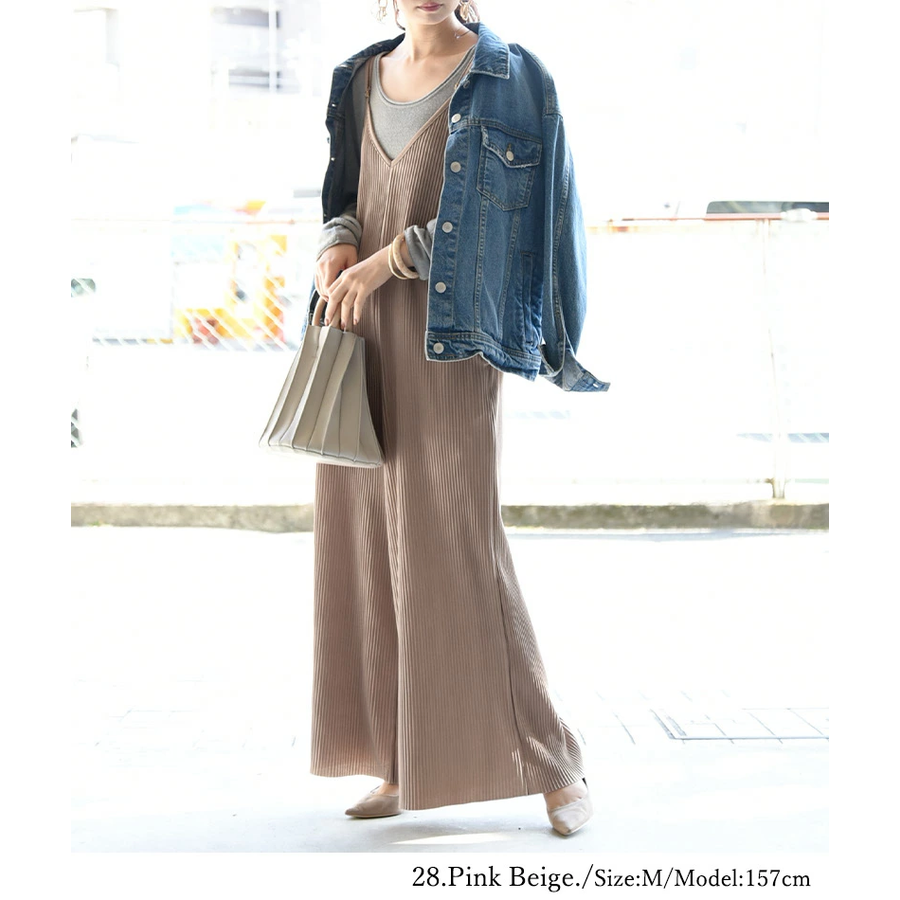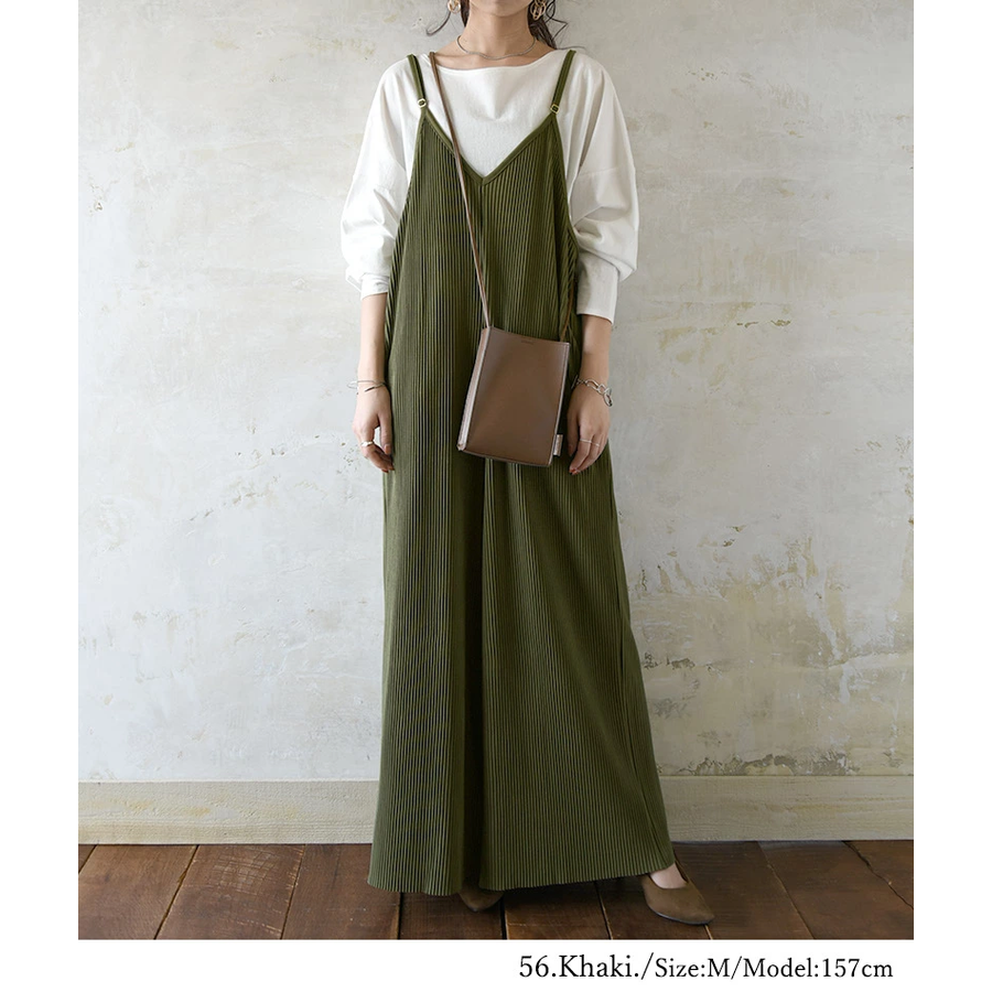 [M]サイズを着用。着丈は肩紐を一番短くしてかかとが半分隠れるくらいでした。ゆったりとしたシルエットでヒップや太ももにゆとりがあるのでとてもラフな着心地です◎少し厚手のニットと合わせたときにも窮屈感はなかったです♪