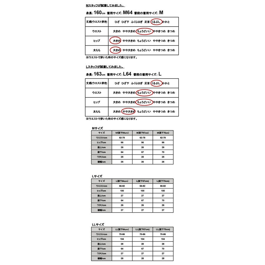 | サイズ | M、股下64cm / M、股下67cm / M、股下70cm / L、股下64cm / L、股下67cm / L、股下70cm / LL、股下64cm / LL、股下67cm / LL、股下70cm |