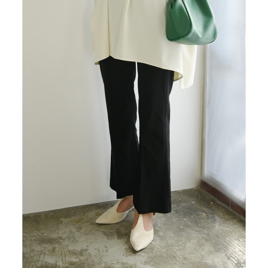ぴったりし過ぎず身体のラインを拾わない、大人世代にも履きやすいフレアパンツ。伸縮性があり動きやすい生地感です◎