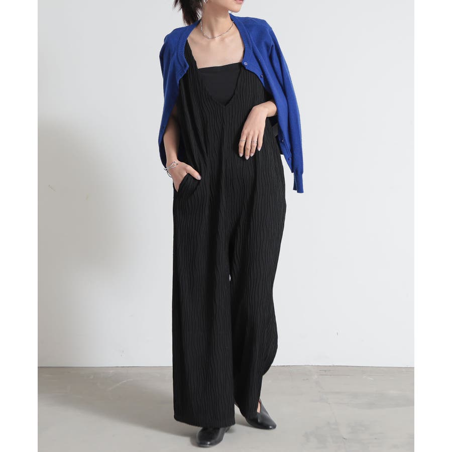 立体感のあるリップル素材。伸縮性があり、ゆったりめのオールインワンで楽な着心地◎深めのVネックで大人っぽい印象です。