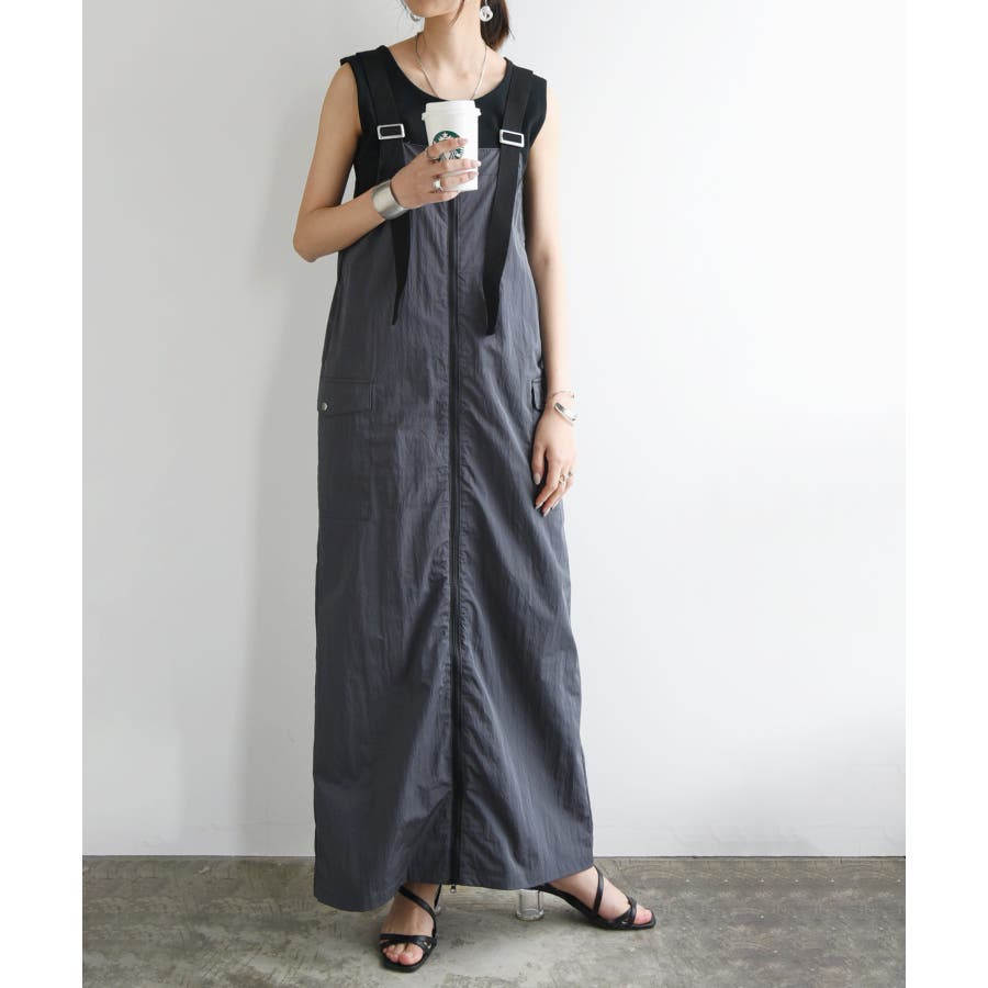 TNタフタの素材感が魅力のフロントジップジャンパースカート。着るだけでこなれ感を演出し、お洒落度がアップします。合わせるアイテムを変えると様々なコーデを楽しめます。