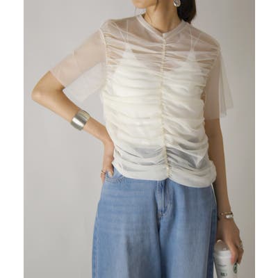 チュールの透け感が上品で、シャーリングデザインがお洒落な1枚。存在感があり、コーデの主役になります。