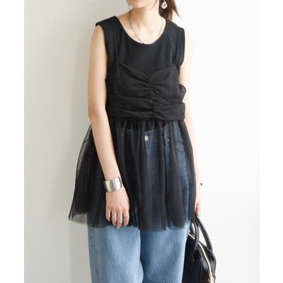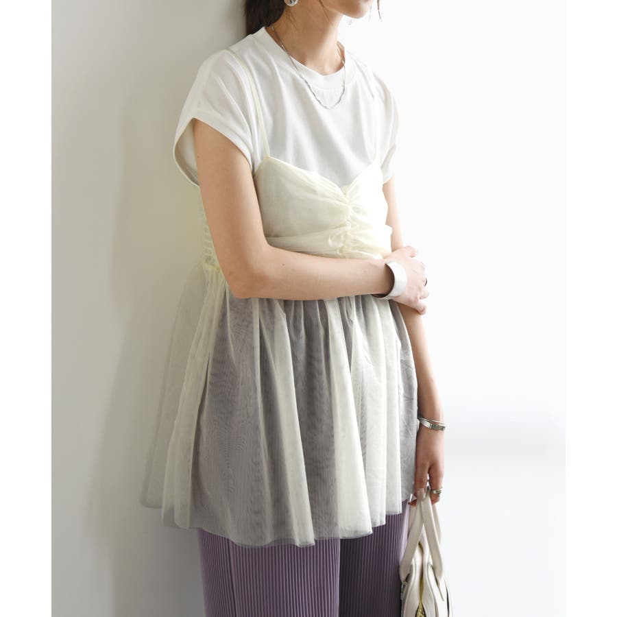 少しラメの入ったチュール生地でシアー感がお洒落なキャミソール。半袖や長袖に合わせたり、重ねるアイテムによって雰囲気も変わります。