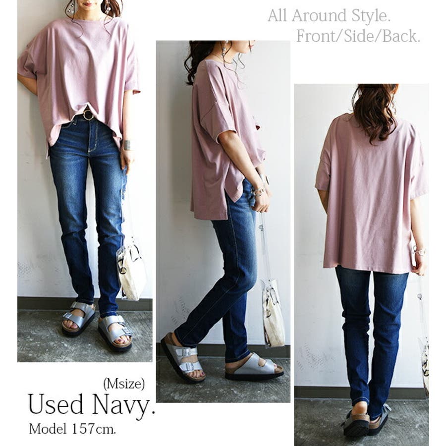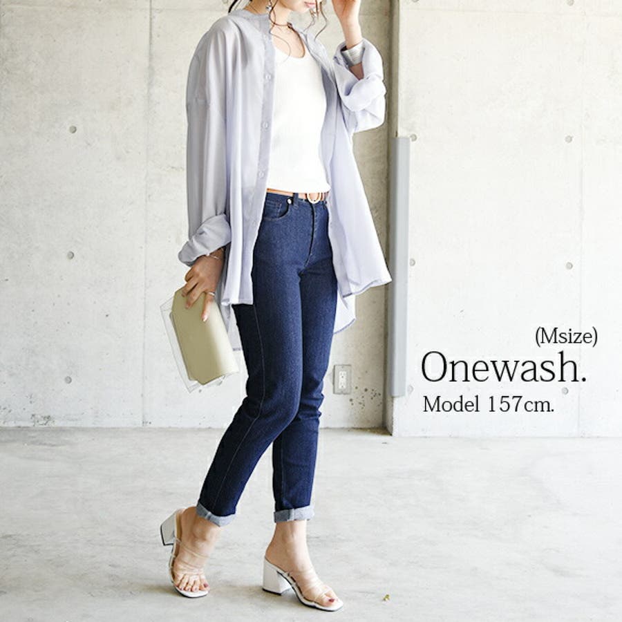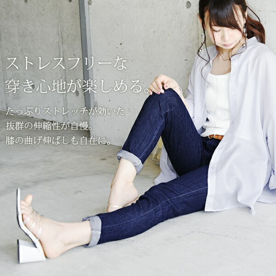 [Mサイズ]を着用。ウエストはややゆとりのある楽なサイズ感。ずり落ちる事はなく、ベルトを合わせるとジャストなサイズ感で穿く事が出来ました♪着丈はくるぶしがすっぽりと隠れるくらいの長さに。機能性素材で暑い季節も快適にスキニーデニムが穿けるのが嬉しい!穿くとひんやりと感じるのがお気に入りです!