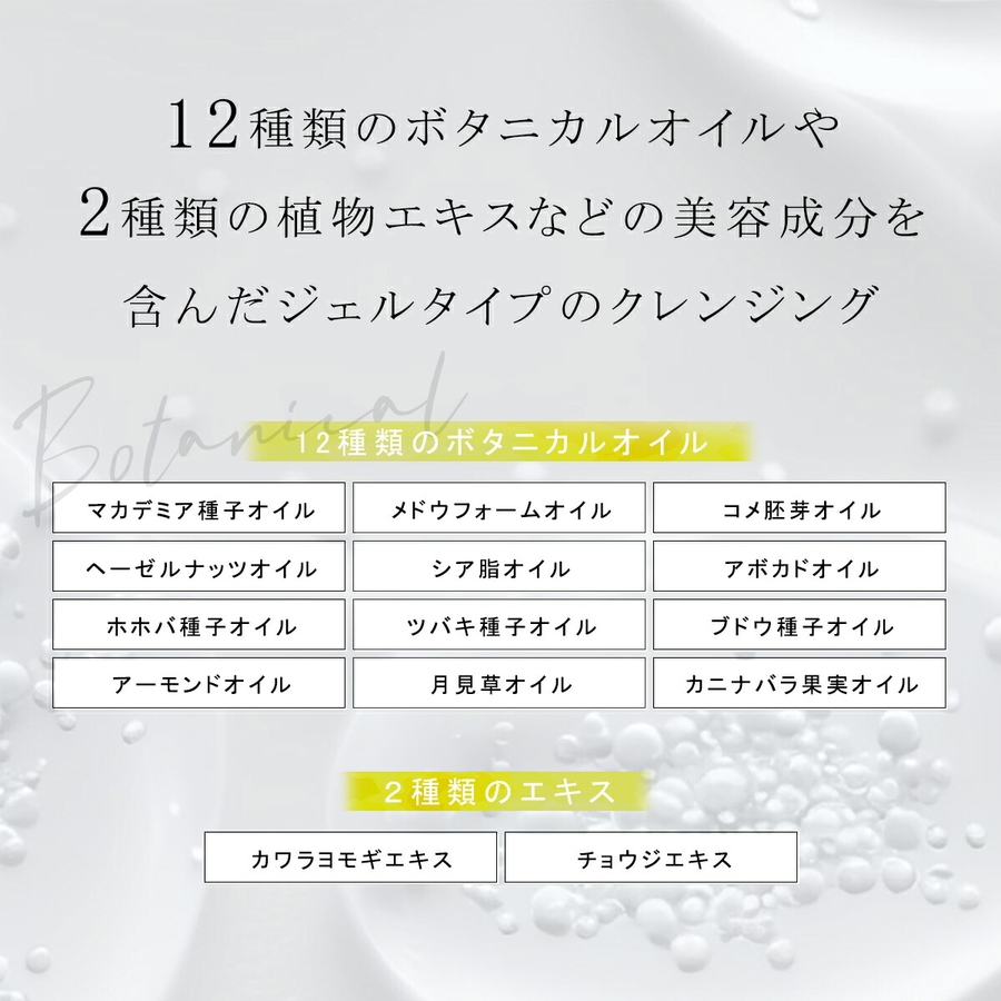 12種類のボタニカルオイル、2種類の植物エキスなど美容成分たっぷりのクレンジングジェル。