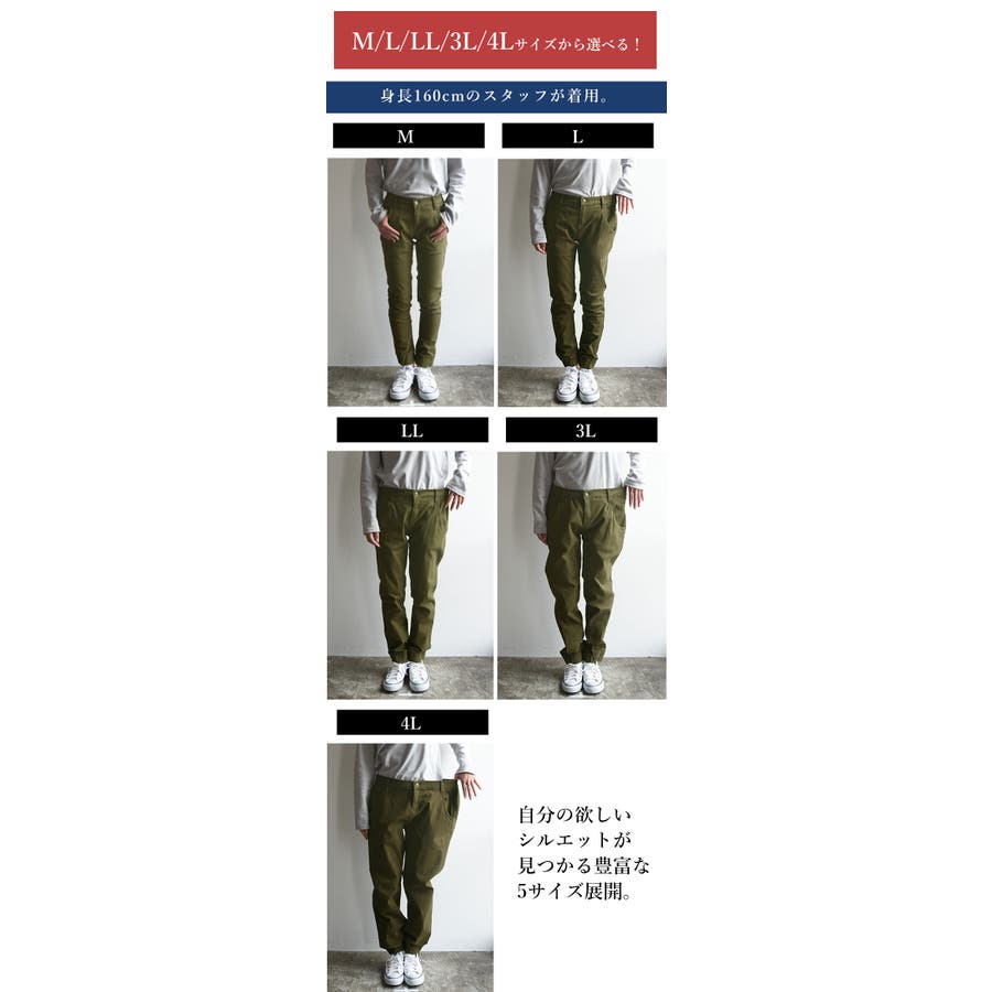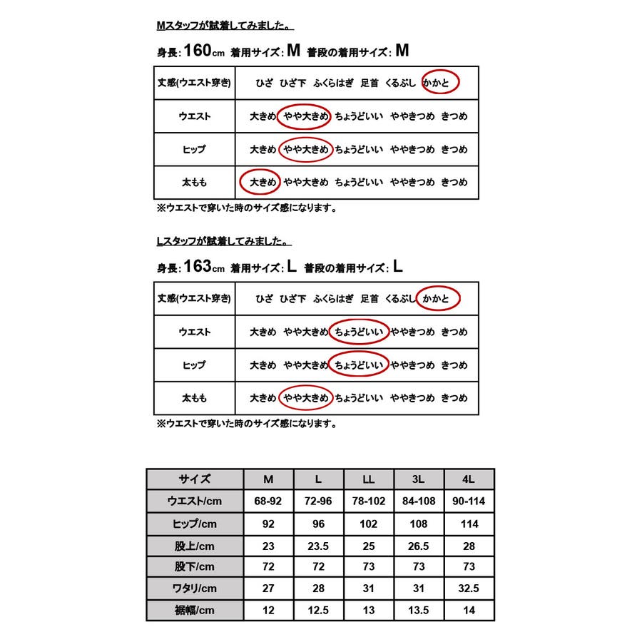 [4L]ウエスト:約90~114cm、ヒップ:約114cm、股上:約28cm、股下:約73cm、ワタリ:約32.5cm、裾幅:約14cm