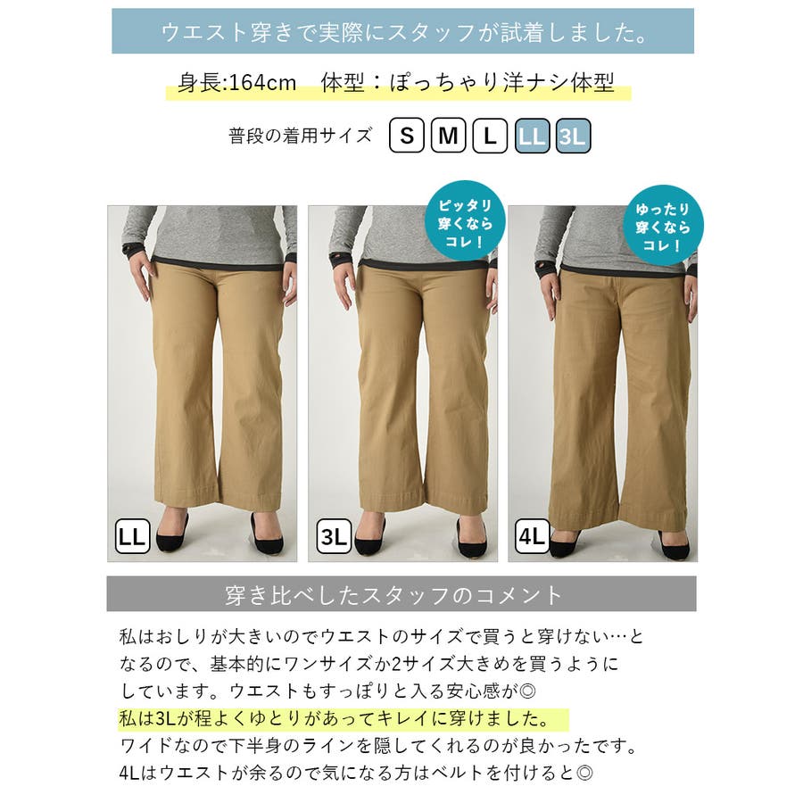 [3L]ウエストやヒップ、太もも周りはぴったりめですが、伸縮性があるので窮屈感なく穿けました。ふくらはぎ周りには少しゆとりがありました。丈はかかとまで長さがあるので裾をロールアップして穿こうと思います。