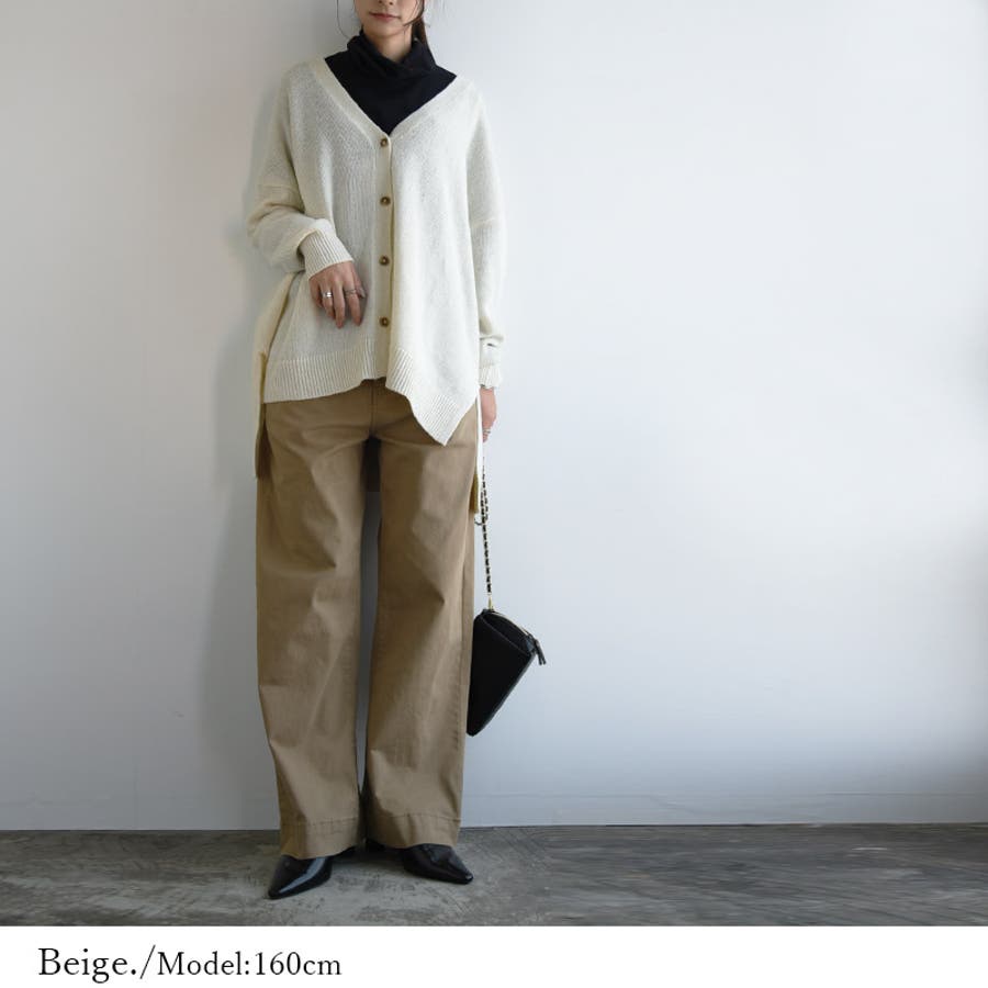 [M]ウエストで穿いてもかかとが隠れるくらいの長め丈で、ロールアップすると可愛い♪程良くゆとりを持って穿けるのでデイリー使いにぴったりです。ルーズ過ぎないワイド幅なので小柄さんでもおしゃれに◎