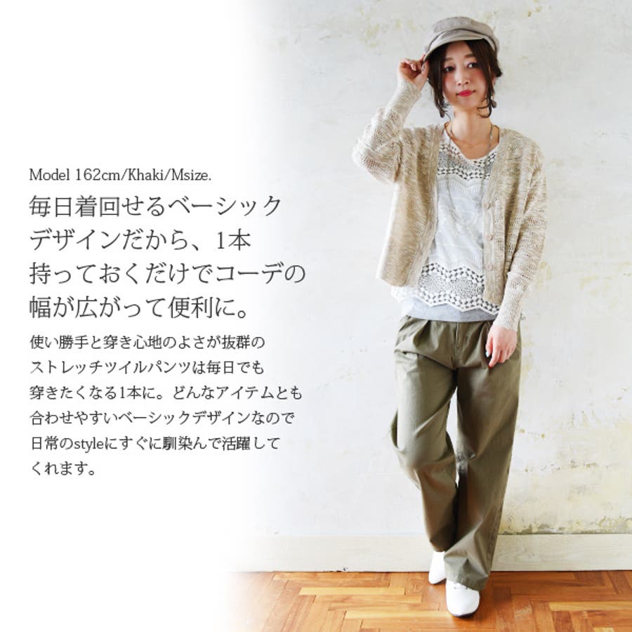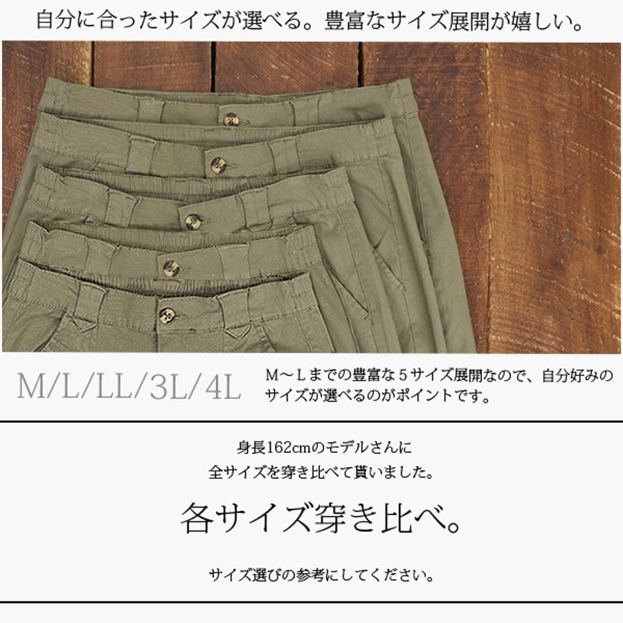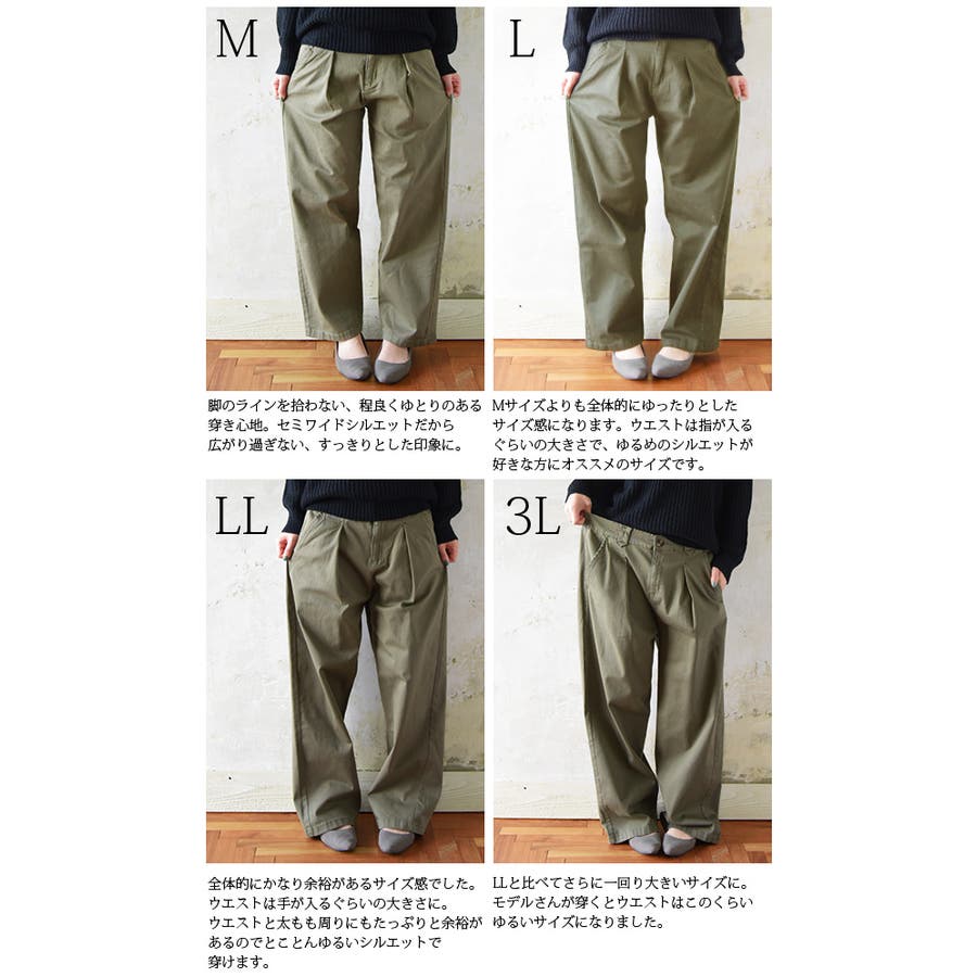 [M]ウエスト68~90ヒップ102股上28股下65.5ワタリ28.2裾幅23[L]ウエスト72~94ヒップ106股上29股下65.5ワタリ30裾幅24[LL]ウエスト78~104ヒップ112股上31.5股下65.5ワタリ30.5裾幅25[3L]ウエスト84~110ヒップ118股上33股下67.5ワタリ33裾幅26.5[4L]ウエスト92~118ヒップ126股上34.5股下67.5ワタリ35裾幅28