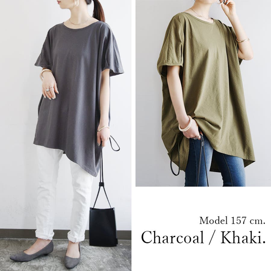 柔らかなコットン100%素材を使用。左右非対称なアシンメトリーなヘムデザインでこなれたスタイリングに!ゆったりシルエットでラフな着心地!