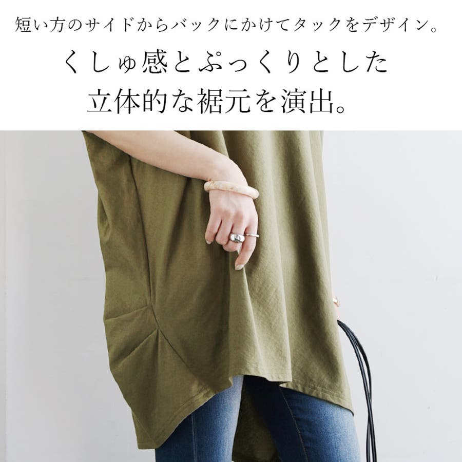 [M-L]サイズを着用。アシメなシルエットやタック使いで周りと差がつくカットソーに!さらりとボトムと合わせるだけでサマになります♪着丈は一番長いところで太ももが半分隠れるくらい、短いところで太ももの3分の1くらいが隠れる丈感になりました。袖丈はひじより7cm上くらい。ゆったり着られるサイズ感が心地良かったです。