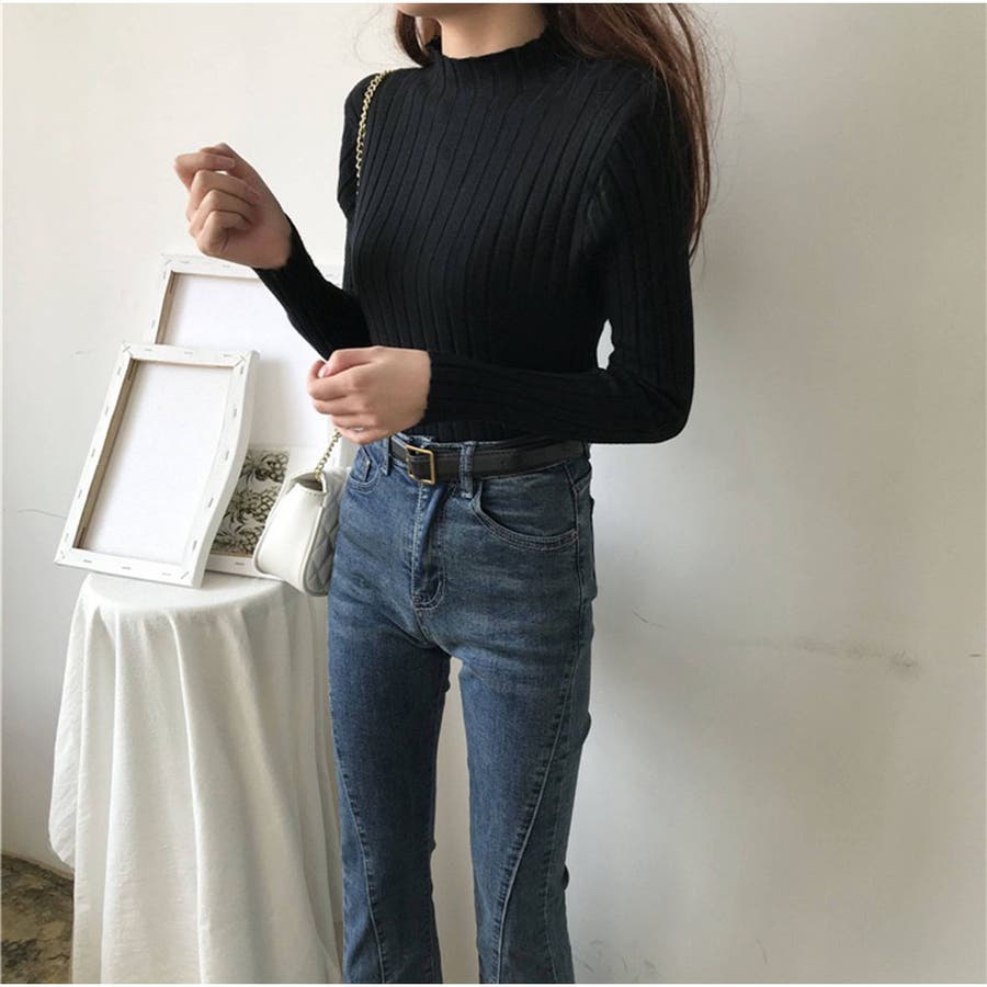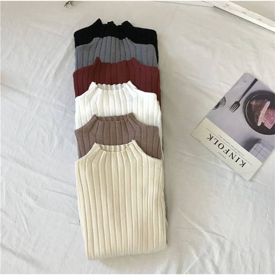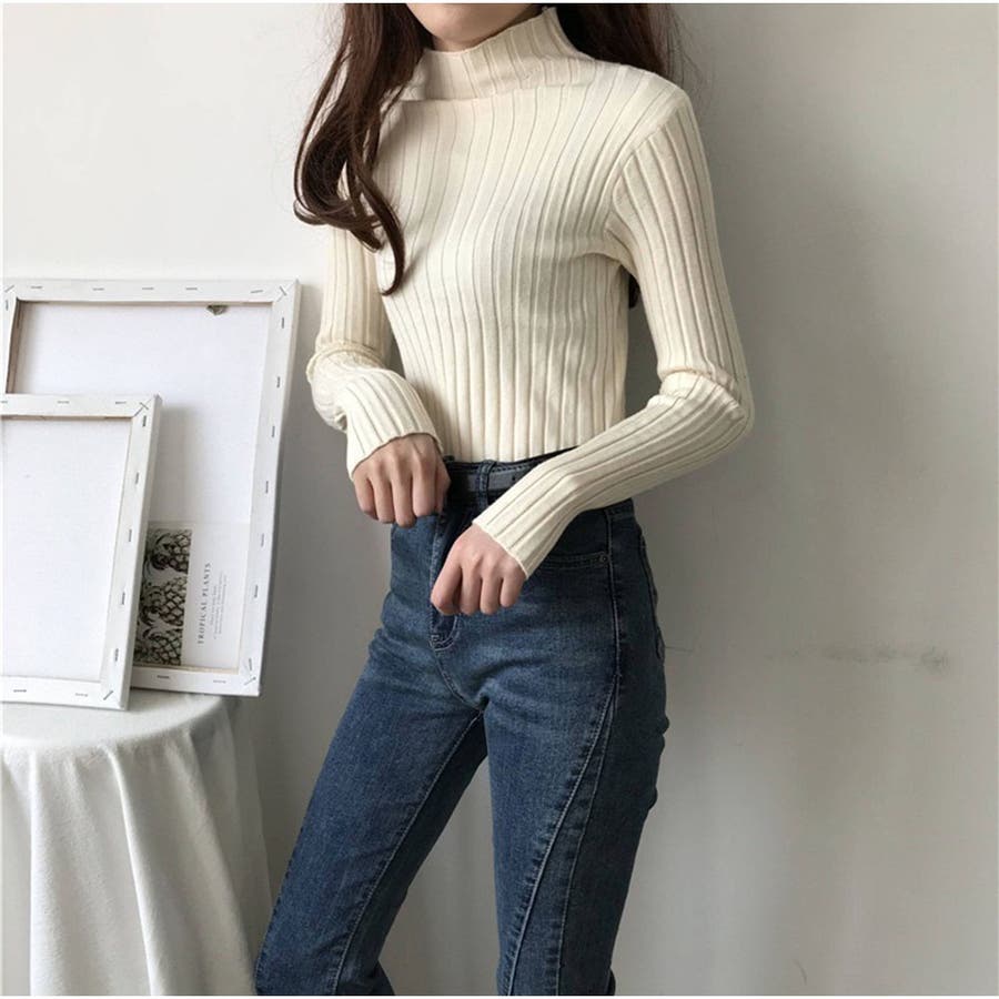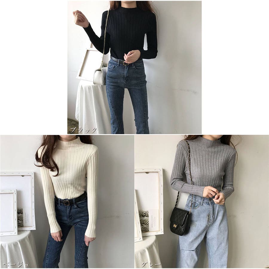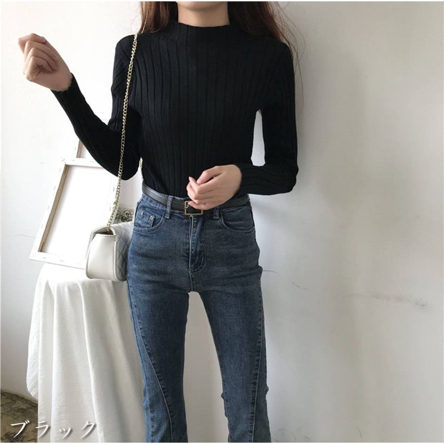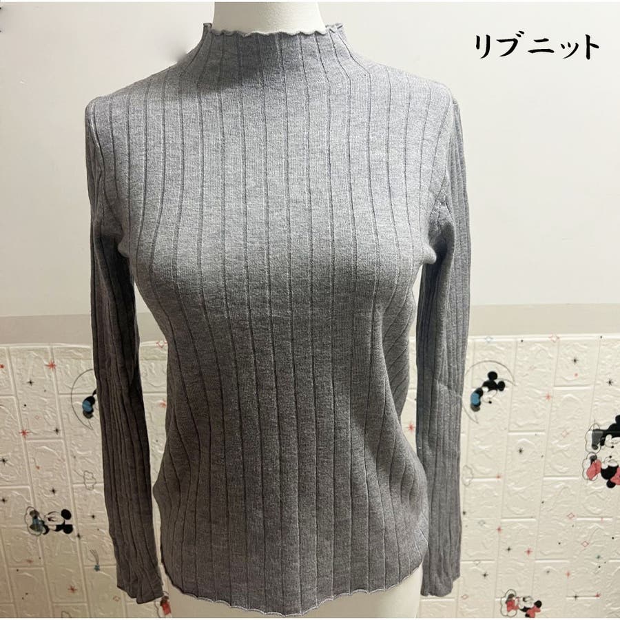 リブニット 長袖 ハイネック 無地 シンプル レディース 秋新作